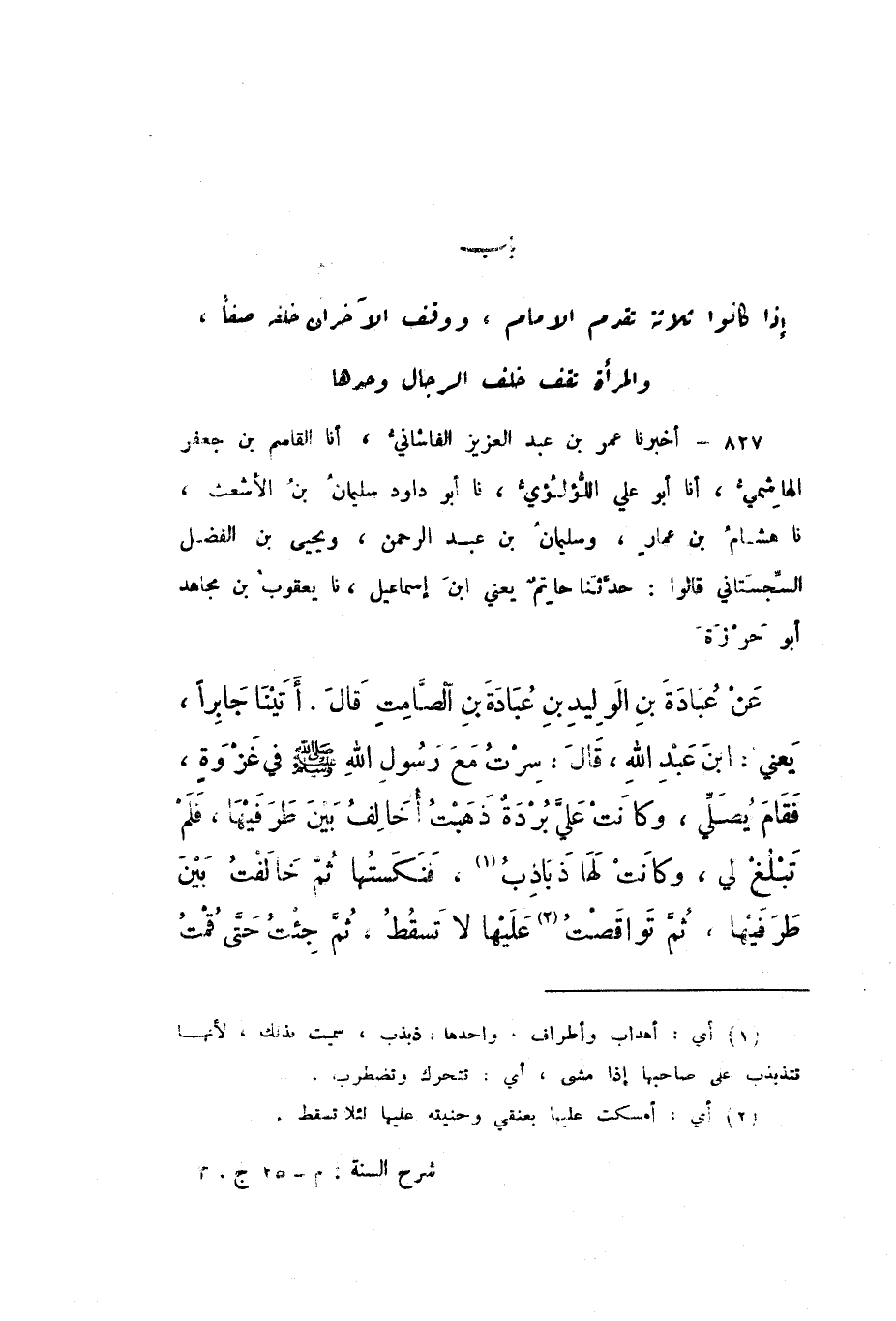 827 - أَخْبَرَنَا عُمَرُ بْنُ عَبْدِ الْعَزِيزِ الْفَاشَانِيُّ، أَنَا الْقَاسِمُ بْنُ جَعْفَرٍ الْهَاشِمِيُّ، أَنَا أَبُو عَلِيٍّ اللُّؤْلُئِيُّ، نَا أَبُو دَاوُدَ سُلَيْمَانُ بْنُ الأَشْعَثِ، نَا هِشَامُ بْنُ عَمَّارٍ، وَسُلَيْمَانُ بْنُ عَبْدِ الرَّحْمَنِ، وَيَحْيَى بْنُ الْفَضْلِ السِّجِسْتَانِيُّ، قَالُوا: حَدَّثَنَا حَاتِمٌ، يَعْنِي: ابْنَ إِسْمَاعِيلَ، نَا يَعْقُوبُ بْنُ مُجَاهِدٍ أَبُو حَرْزَةَ، عَنْ عُبَادَةَ بْنِ الْوَلِيدِ بْنِ عُبَادَةَ بْنِ الصَّامِتِ، قَالَ: أَتَيْنَا جَابِرًا، يَعْنِي: ابْنَ عَبْدِ اللَّهِ، قَالَ: سِرْتُ مَعَ رَسُولِ اللَّهِ صَلَّى اللهُ عَلَيْهِ وَسَلَّمَ فِي غَزْوَةٍ، فَقَامَ يُصَلِّي، وَكَانَتْ عَلَيَّ بُرْدَةٌ ذَهَبْتُ أُخَالِفُ بَيْنَ طَرَفَيْهَا، فَلَمْ تَبْلُغْ لِي، وَكَانَتْ لَهَا ذَبَاذِبُ، فَنَكَّسْتُهَا، ثُمَّ خَالَفْتُ بَيْنَ طَرَفَيْهَا، ثُمَّ تَوَاقَصْتُ عَلَيْهَا لَا تَسْقُطُ، ثُمَّ جِئْتُ حَتَّى قُمْتُ