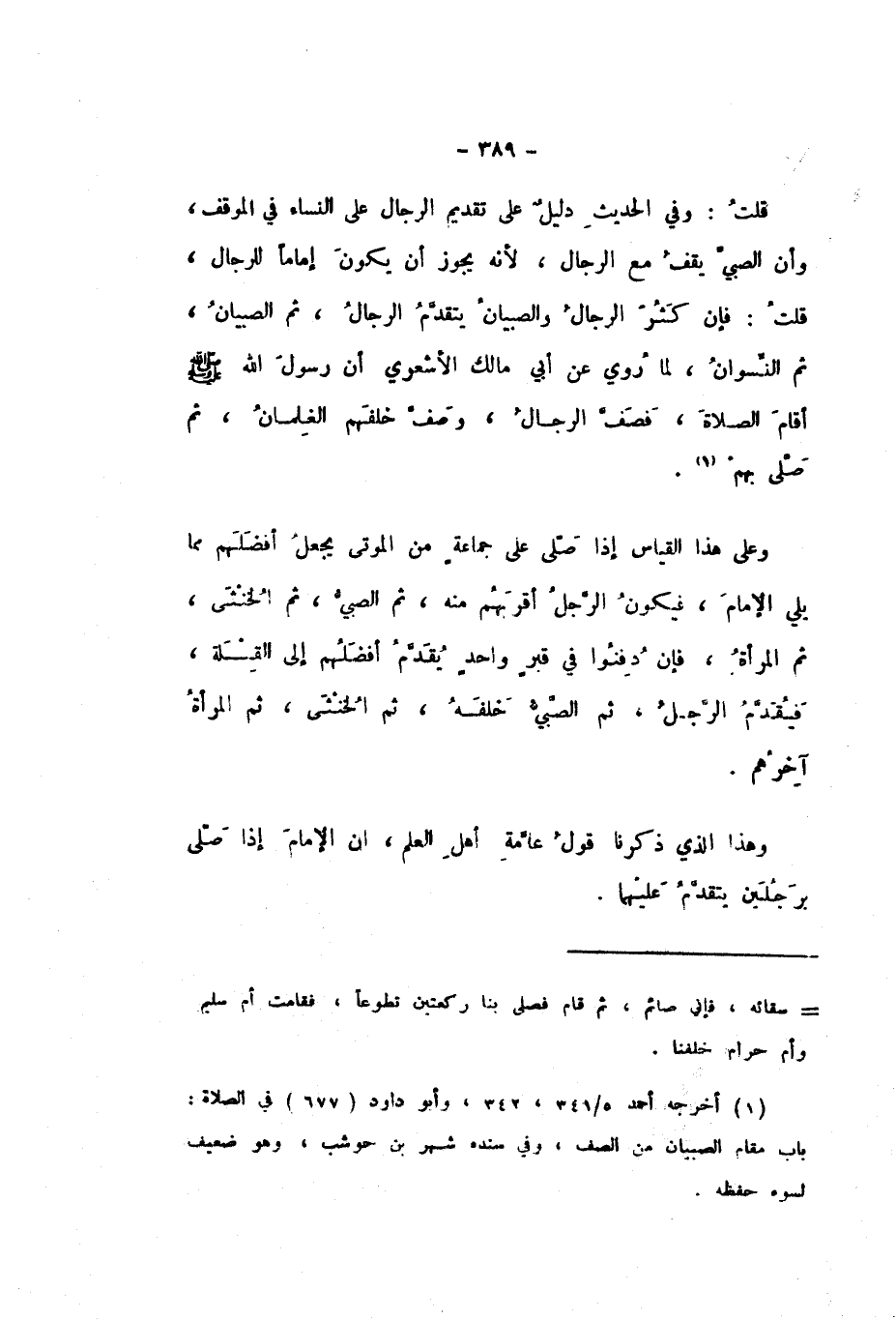 قُلْتُ: وَفِي الْحَدِيثِ دَلِيلٌ عَلَى تَقْدِيمِ الرِّجَالِ عَلَى النِّسَاءِ فِي الْمَوْقِفِ، وَأَنَّ الصَّبِيَّ يَقِفُ مَعَ الرِّجَالِ، لأَنَّهُ يَجُوزُ أَنْ يَكُونَ إِمَامًا لِلرِّجَالِ، قُلْتُ: فَإِنْ كَثُرَ الرِّجَالُ وَالصِّبْيَانُ، يَتَقَدَّمُ الرِّجَالُ، ثُمَّ الصِّبْيَانُ، ثُمَّ النِّسْوَانُ، لِمَا رُوِيَ عَنْ أَبِي مَالِكٍ الأَشْعَرِيِّ، «أَنَّ رَسُولَ اللَّهِ صَلَّى اللهُ عَلَيْهِ وَسَلَّمَ أَقَامَ الصَّلاةَ، فَصَفَّ الرِّجَالُ، وَصَفَّ خَلْفَهُمُ الْغِلْمَانُ، ثُمَّ صَلَّى بِهِمْ».
