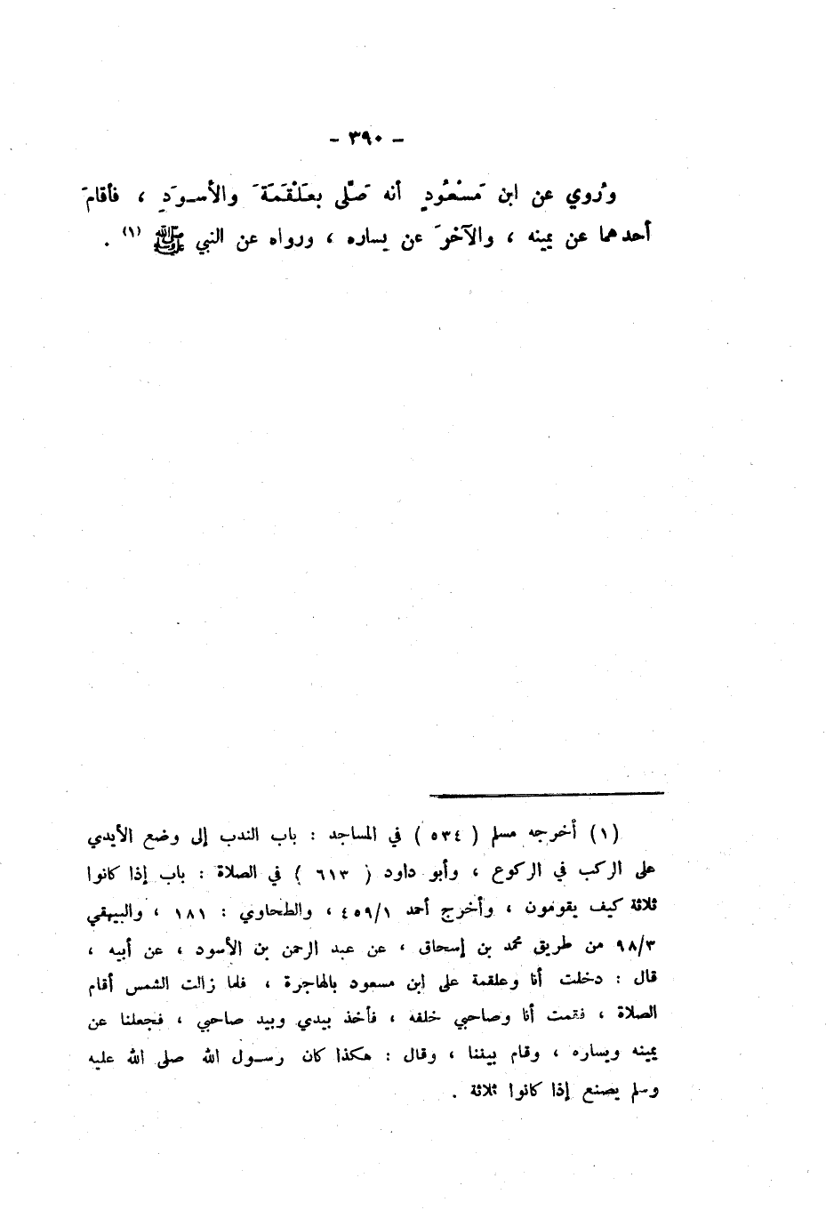 رُوِيَ عَنِ ابْنِ مَسْعُودٍ، أَنَّهُ صَلَّى بِعَلْقَمَةَ، وَالأَسْوَدِ، فَأَقَامَ أَحَدَهُمَا عَنْ يَمِينِهِ، وَالآخَرَ عَنْ يَسَارِهِ، وَرَوَاهُ عَنِ النَّبِيِّ صَلَّى اللهُ عَلَيْهِ وَسَلَّمَ.