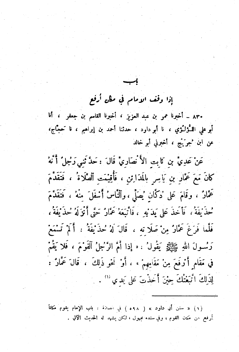 830 - أَخْبَرَنَا عُمَرُ بْنُ عَبْدِ الْعَزِيزِ، أَخْبَرَنَا الْقَاسِمُ بْنُ جَعْفَرٍ، أَنَا أَبُو عَلِيٍّ اللُّؤْلُئِيُّ، نَا أَبُو دَاوُدَ، حَدَّثَنَا أَحْمَدُ بْنُ إِبْرَاهِيمَ، نَا حَجَّاجٌ، عَنِ ابْنِ جُرَيْجٍ، أَخْبَرَنِي أَبُو خَالِدٍ، عَنْ عَدِيِّ بْنِ ثَابِتٍ الأَنْصَارِيِّ، قَالَ: حَدَّثَنِي رَجُلٌ، أَنَّهُ كَانَ مَعَ عَمَّارِ بْنِ يَاسِرٍ بِالْمَدَائِنِ، فَأُقِيمَتِ الصَّلاةُ، فَتَقَدَّمَ عَمَّارٌ، وَقَامَ عَلَى دُكَّانٍ يُصَلِّي، وَالنَّاسُ أَسْفَلَ مِنْهُ، فَتَقَدَّمَ حُذَيْفَةُ، فَأَخَذَ عَلَى يَدَيْهِ، فَاتَّبَعَهُ عَمَّارٌ حَتَّى أَنْزَلَهُ حُذَيْفَةُ، فَلَمَّا فَرَغَ عَمَّارٌ مِنْ صَلاتِهِ، قَالَ لَهُ حُذَيْفَةُ: أَلَمْ تَسْمَعْ رَسُولَ اللَّهِ صَلَّى اللهُ عَلَيْهِ وَسَلَّمَ يَقُولُ: «إِذَا أَمَّ الرَّجُلُ الْقَوْمَ، فَلا يَقُمْ فِي مَقَامٍ أَرْفَعَ مِنْ مَقَامِهِمْ»، أَوْ نَحْوَ ذَلِكَ، قَالَ عَمَّارٌ: لِذَلِكَ اتَّبَعْتُكَ حِينَ أَخَذْتَ عَلَى يَدِي.