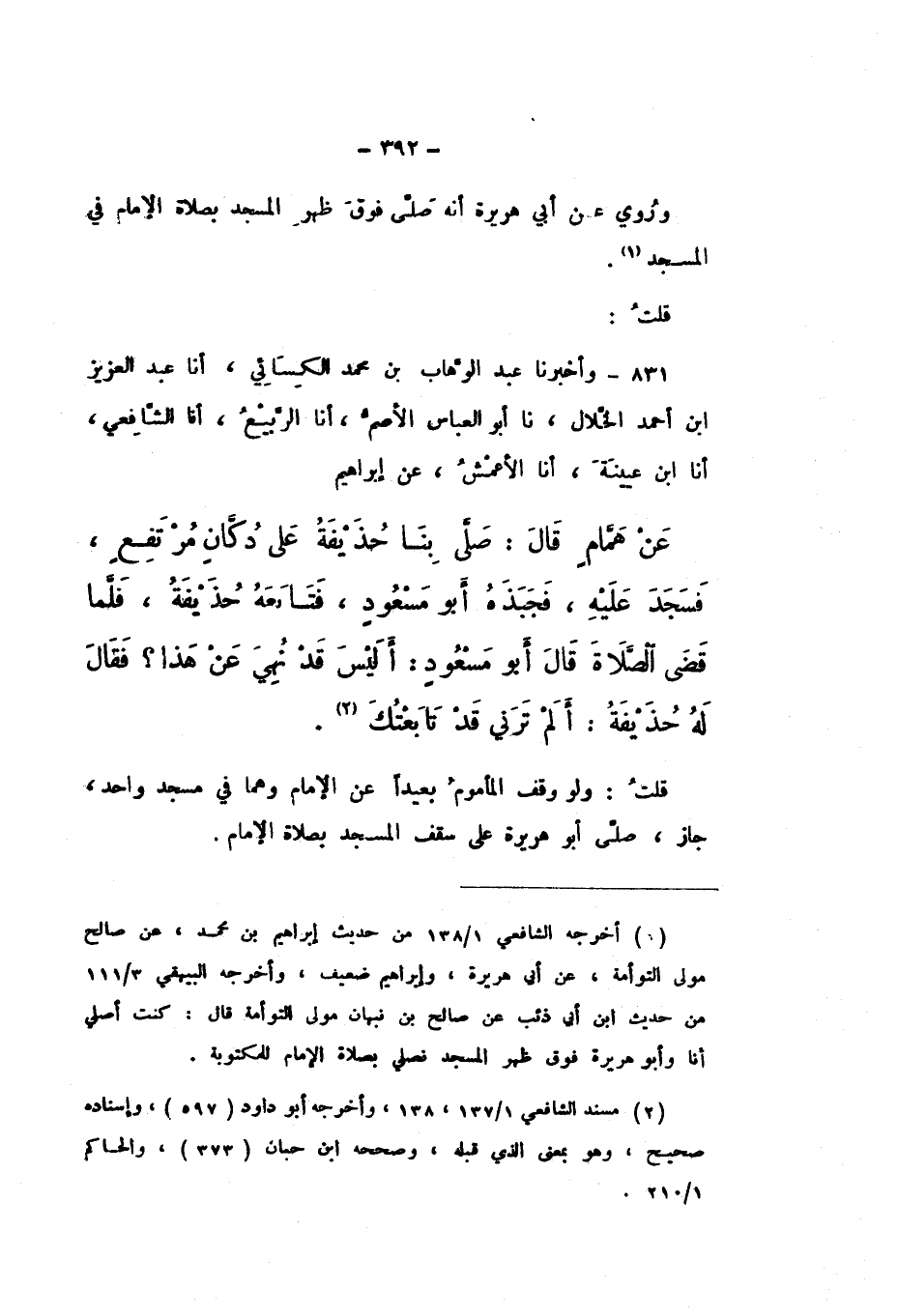 381 - وَأَخْبَرَنَا عَبْدُ الْوَهَّابِ بْنُ مُحَمَّدٍ الْكِسَائِيُّ، أَنَا عَبْدُ الْعَزِيزِ بْنُ أَحْمَدَ الْخَلالُ، نَا أَبُو الْعَبَّاسِ الأَصَمُّ، أَنَا الرَّبِيعُ، أَنَا الشَّافِعِيُّ، أَنَا ابْنُ عُيَيْنَةَ، أَنَا الأَعْمَشُ، عَنْ إِبْرَاهِيمَ، عَنْ هَمَّامٍ، قَالَ: " صَلَّى بِنَا حُذَيْفَةُ عَلَى دُكَّانٍ مُرْتَفِعٍ، فَسَجَدَ عَلَيْهِ، فَجَبَذَهُ أَبُو مَسْعُودٍ، فَتَابَعَهُ حُذَيْفَةُ، فَلَمَّا قَضَى الصَّلاةَ، قَالَ أَبُو مَسْعُودٍ: أَلَيْسَ قَدْ نُهِيَ عَنْ هَذَا؟ فَقَالَ لَهُ حُذَيْفَةُ: ألَمْ تَرَنِي قَدْ تَابَعْتُكَ "