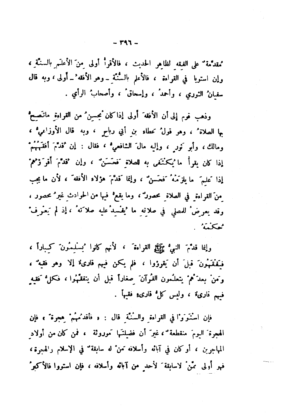 مُقَدَّمَةٌ عَلَى الْفِقْهِ، لِظَاهِرِ الْحَدِيثِ، فَالأَقْرَأُ أَوْلَى مِنَ الأَعْلَمِ بِالسُّنَّةِ، وَإِنِ اسْتَوَيَا فِي الْقِرَاءَةِ، فَالأَعْلَمُ بِالسُّنَّةِ، وَهُوَ الأَفْقَهُ , أَوْلَى , وَبِهِ قَالَ سُفْيَانُ الثَّوْرِيُّ، وَأَحْمَدُ، وَإِسْحَاقُ، وَأَصْحَابُ الرَّأْيِ.