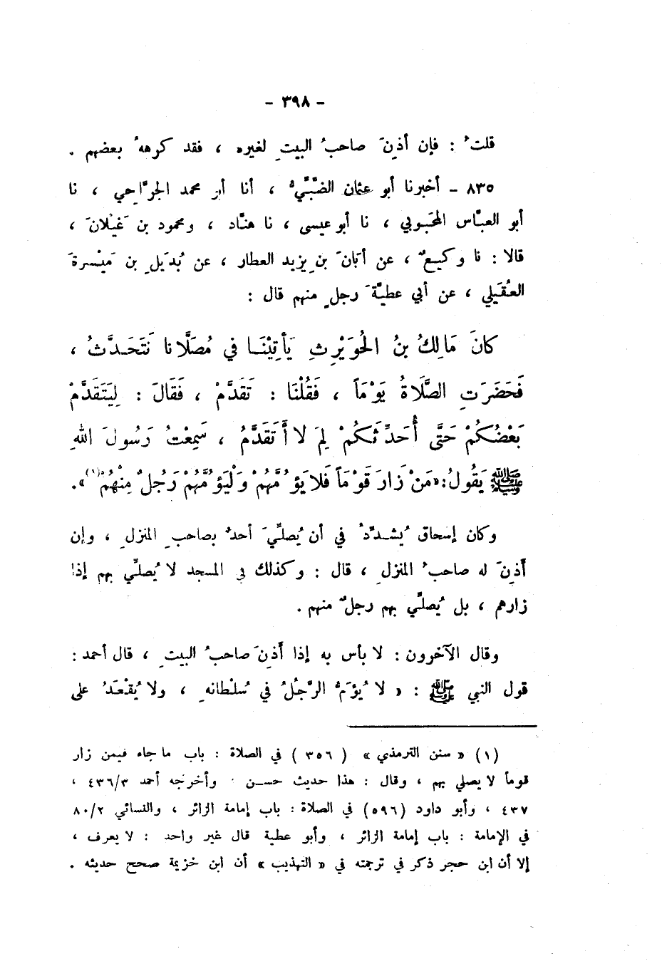 835 - أَخْبَرَنَا أَبُو عُثْمَانَ الضَّبِّيُّ، أَنَا أَبُو مُحَمَّدٍ الْجَرَّاحِيُّ، نَا أَبُو الْعَبَّاسِ الْمَحْبُوبِيُّ، نَا أَبُو عِيسَى، نَا هَنَّادٌ، وَمَحْمُودُ بْنُ غَيْلانَ، قَالا: نَا وَكِيعٌ، عَنْ أَبَانِ بْنِ يَزِيدَ الْعَطَّارِ، عَنْ بُدَيْلِ بْنِ مَيْسَرَةَ الْعُقَيْلِيِّ، عَنْ أَبِي عَطِيَّةَ رَجُلٍ مِنْهُمْ، قَالَ: كَانَ مَالِكُ بْنُ الْحُوَيْرِثِ يَأْتِينَا فِي مُصَلانَا نَتَحَدَّثُ، فَحَضَرَتِ الصَّلاةُ يَوْمًا، فَقُلْنَا: تَقَدَّمْ، فَقَالَ: لِيَتَقَدَّمْ بَعْضُكُمْ حَتَّى أُحَدِّثَكُمْ لِمَ لَا أَتَقَدَّمُ، سَمِعْتُ رَسُولَ اللَّهِ صَلَّى اللهُ عَلَيْهِ وَسَلَّمَ يَقُولُ: «مَنْ زَارَ قَوْمًا فَلا يَؤُمَّهُمْ وَلْيَؤُمَّهُمْ رَجُلٌ مِنْهُمْ»