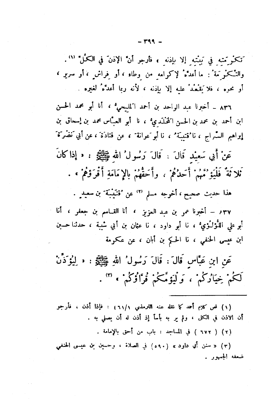 836 - أَخْبَرَنَا عَبْدُ الْوَاحِدِ بْنُ أَحْمَدَ الْمَلِيحِيُّ، أَنَا أَبُو مُحَمَّدٍ الْحَسَنُ بْنُ أَحْمَدَ بْنِ مُحَمَّدِ بْنِ الْحَسَنِ الْمَخْلَدِيُّ، نَا أَبُو الْعَبَّاسِ مُحَمَّدُ بْنُ إِسْحَاقَ بْنِ إِبْرَاهِيمَ السَّرَّاجُ، نَا قُتَيْبَةُ، نَا أَبُو عَوَانَةَ، عَنْ قَتَادَةَ، عَنْ أَبِي نَضْرَةَ، عَنْ أَبِي سَعِيدٍ، قَالَ: قَالَ رَسُولُ اللَّهِ صَلَّى اللهُ عَلَيْهِ وَسَلَّمَ: «إِذَا كَانَ ثَلاثَةٌ فَلْيَؤُمَّهُمْ أَحَدُهُمْ، وَأَحَقُّهُمْ بِالإِمَامَةِ أَقْرَؤُهُمْ».