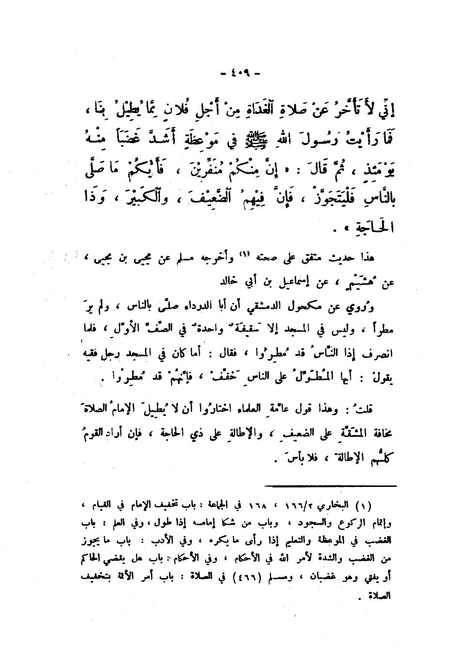 إِنِّي لأَتَأَخَّرُ عَنْ صَلاةِ الْغَدَاةِ مِنْ أَجْلِ فُلانٍ مِمَّا يُطِيلُ بِنَا، فَمَا رَأَيْتُ رَسُولَ اللَّهِ صَلَّى اللهُ عَلَيْهِ وَسَلَّمَ فِي مَوْعِظَةٍ أَشَدَّ غَضَبًا مِنْهُ يَوْمَئِذٍ، ثُمَّ قَالَ: «إِنَّ مِنْكُمْ مُنَفِّرِينَ، فَأَيُّكُمْ مَا صَلَّى بِالنَّاسِ فَلْيَتَجَوَّزْ، فَإِنَّ فِيهِمُ الضَّعِيفَ، وَالْكَبِيرَ، وَذَا الْحَاجَةِ».