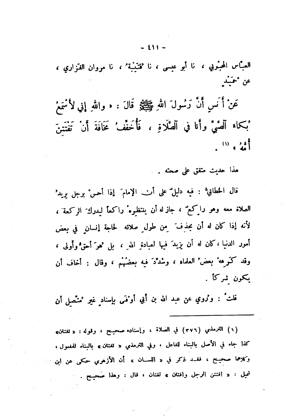 الْعَبَّاسِ الْمَحْبُوبِيُّ، نَا أَبُو عِيسَى، نَا قُتَيْبَةُ، نَا مَرْوَانُ الْفَزَارِيُّ، عَنْ حُمَيْدٍ، عَنْ أَنَسٍ، أَنَّ رَسُولَ اللَّهِ صَلَّى اللهُ عَلَيْهِ وَسَلَّمَ، قَالَ: «وَاللَّهِ إِنِّي لأَسْمَعُ بُكَاءَ الصَّبِيِّ وَأَنَا فِي الصَّلاةِ، فَأُخَفِّفُ مَخَافَةَ أَنْ تُفْتَتَنَ أُمُّهُ».