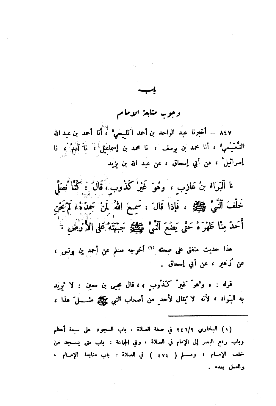 847 - أَخْبَرَنَا عَبْدُ الْوَاحِدِ بْنُ أَحْمَدَ الْمَلِيحِيُّ، أَنَا أَحْمَدُ بْنُ عَبْدِ اللَّهِ النُّعَيْمِيُّ، أَنَا مُحَمَّدُ بْنُ يُوسُفَ، نَا مُحَمَّدُ بْنُ إِسْمَاعِيلَ، نَا آدَمُ، نَا إِسْرَائِيلُ، عَنْ أَبِي إِسْحَاقَ، عَنْ عَبْدِ اللَّهِ بْنِ يَزِيدَ، نَا الْبَرَاءُ بْنُ عَازِبٍ، وَهُوَ غَيْرُ كَذُوبٍ، قَالَ: " كُنَّا نُصَلِّي خَلْفَ النَّبِيِّ صَلَّى اللهُ عَلَيْهِ وَسَلَّمَ، فَإِذَا قَالَ: سَمِعَ اللَّهُ لِمَنْ حَمِدَهُ، لَمْ يَحْنِ أَحَدٌ مِنَّا ظَهْرَهُ، حَتَّى يَضَعَ النَّبِيُّ صَلَّى اللهُ عَلَيْهِ وَسَلَّمَ جَبْهَتَهُ عَلَى الأَرْضِ ".