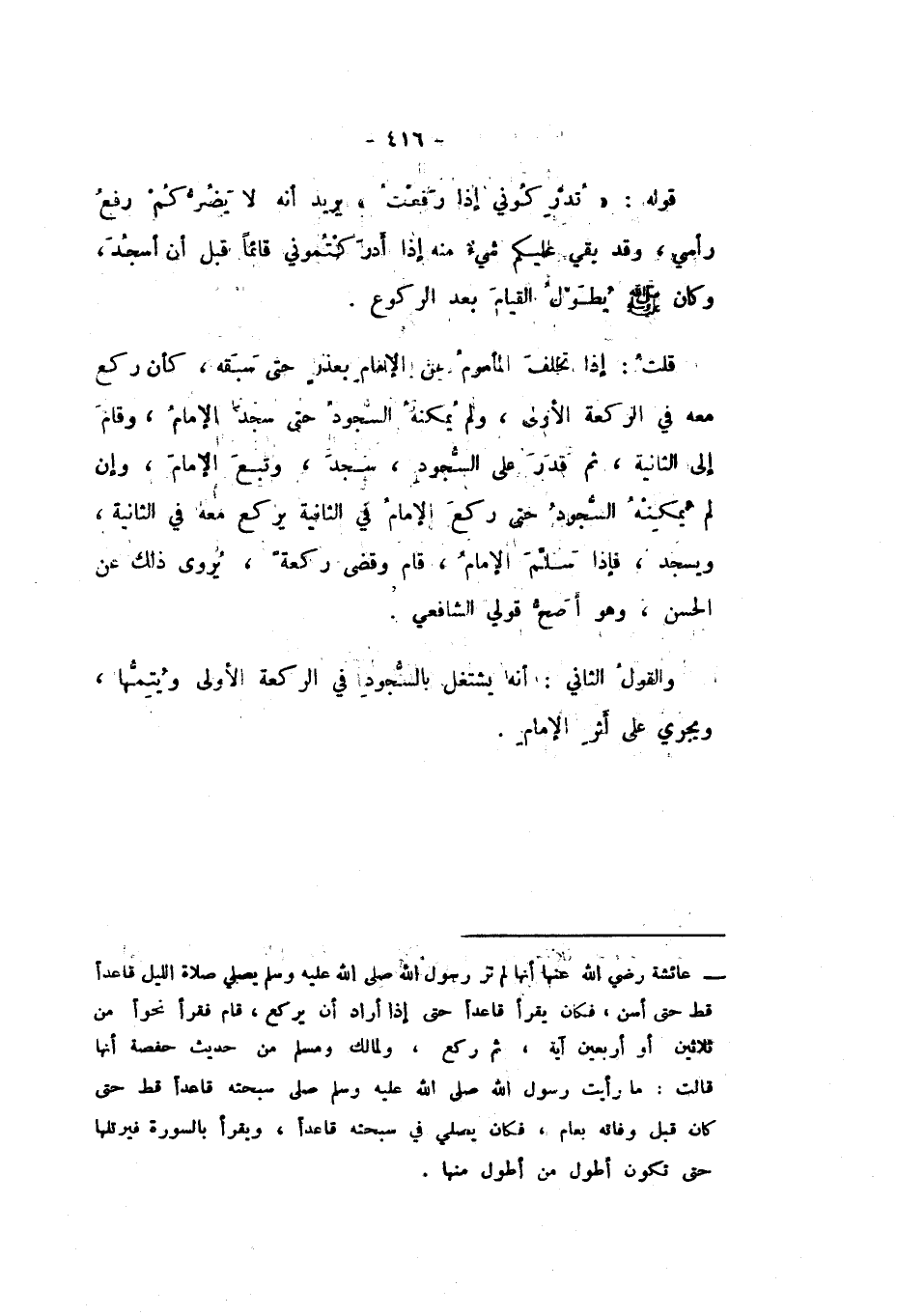 قُلْتُ: إِذَا تَخَلَّفَ الْمَأْمُومُ عَنِ الإِمَامِ بِعُذْرٍ حَتَّى سَبَقَهُ، كَأَنْ رَكَعَ مَعَهُ فِي الرَّكْعَةِ الأُولَى، وَلَمْ يُمْكِنْهُ السُّجُودَ حَتَّى سَجَدَ الإِمَامُ، وَقَامَ إِلَى الثَّانِيَةِ، ثُمَّ قَدَرَ عَلَى السُّجُودِ، سَجَدَ، وَتَبِعَ الإِمَامَ، وَإِنْ لَمْ يُمْكِنْهُ السُّجُودَ حَتَّى رَكَعَ الإِمَامُ فِي الثَّانِيَةِ يَرْكَعُ مَعَهُ فِي الثَّانِيَةِ، وَيَسْجُدُ، فَإِذَا سَلَّمَ الإِمَامُ، قَامَ وَقَضَى رَكْعَةً، يُرْوَى ذَلِكَ عَنِ الْحَسَنِ، وَهُوَ أَصَحُّ قَوْلَيِ الشَّافِعِيِّ.