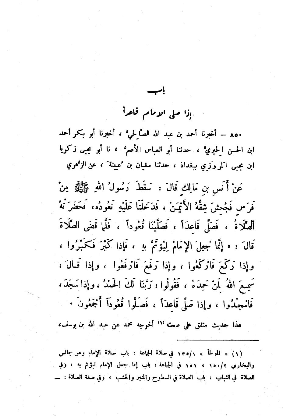 850 - أَخْبَرَنَا أَحْمَدُ بْنُ عَبْدِ اللَّهِ الصَّالِحِيُّ، أَخْبَرَنَا أَبُو بَكْرٍ أَحْمَدُ بْنُ الْحَسَنِ الْحِيرِيُّ، حَدَّثَنَا أَبُو الْعَبَّاسِ الأَصَمُّ، نَا أَبُو يَحْيَى زَكَرِيَّا بْنُ يَحْيَى الْمَرْوَزِيُّ، بِبَغْدَادَ، حَدَّثَنَا سُفْيَان بْنُ عُيَيْنَةَ، عَنِ الزُّهْرِيِّ، عَنْ أَنَسِ بْنِ مَالِكٍ، قَالَ: سَقَطَ رَسُولُ اللَّهِ صَلَّى اللهُ عَلَيْهِ وَسَلَّمَ مِنْ فَرَسٍ فَجُحِشَ شِقُّهُ الأَيْمَنُ، فَدَخَلْنَا عَلَيْهِ نَعُودُهُ، فَحَضَرَتْهُ الصَّلاةُ، فَصَلَّى قَاعِدًا، فَصَلَّيْنَا قُعُودًا، فَلَمَّا قَضَى الصَّلاةَ، قَالَ: " إِنَّمَا جُعِلَ الإِمَامُ لِيُؤْتَمَّ بِهِ، فَإِذَا كَبَّرَ فَكَبِّرُوا، وَإِذَا رَكَعَ فَارْكَعُوا، وَإِذَا رَفَعَ فَارْفَعُوا، وَإِذَا قَالَ: سَمِعَ اللَّهُ لِمَنْ حَمِدَهُ، فَقُولُوا: رَبَّنَا لَكَ الْحَمْدُ، وَإِذَا سَجَدَ، فَاسْجُدُوا، وَإِذَا صَلَّى قَاعِدًا، فَصَلُّوا قُعُودًا أَجْمَعُونَ ".