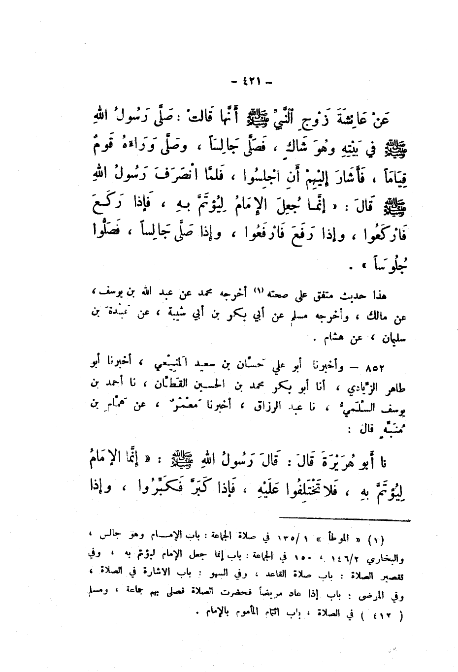 عَنْ عَائِشَةَ، زَوْجِ النَّبِيِّ صَلَّى اللهُ عَلَيْهِ وَسَلَّمَ، أَنَّهَا قَالَتْ: صَلَّى رَسُولُ اللَّهِ صَلَّى اللهُ عَلَيْهِ وَسَلَّمَ فِي بَيْتِهِ وَهُوَ شَاكٍ، فَصَلَّى جَالِسًا، وَصَلَّى وَرَاءَهُ قَوْمٌ قِيَامًا، فَأَشَارَ إِلَيْهِمْ أَنِ اجْلِسُوا، فَلَمَّا انْصَرَفَ رَسُولُ اللَّهِ صَلَّى اللهُ عَلَيْهِ وَسَلَّمَ، قَالَ: «إِنَّمَا جُعِلَ الإِمَامُ لِيُؤْتَمَّ بِهِ، فَإِذَا رَكَعَ فَارْكَعُوا، وَإِذَا رَفَعَ فَارْفَعُوا، وَإِذَا صَلَّى جَالِسًا، فَصَلُّوا جُلُوسًا».