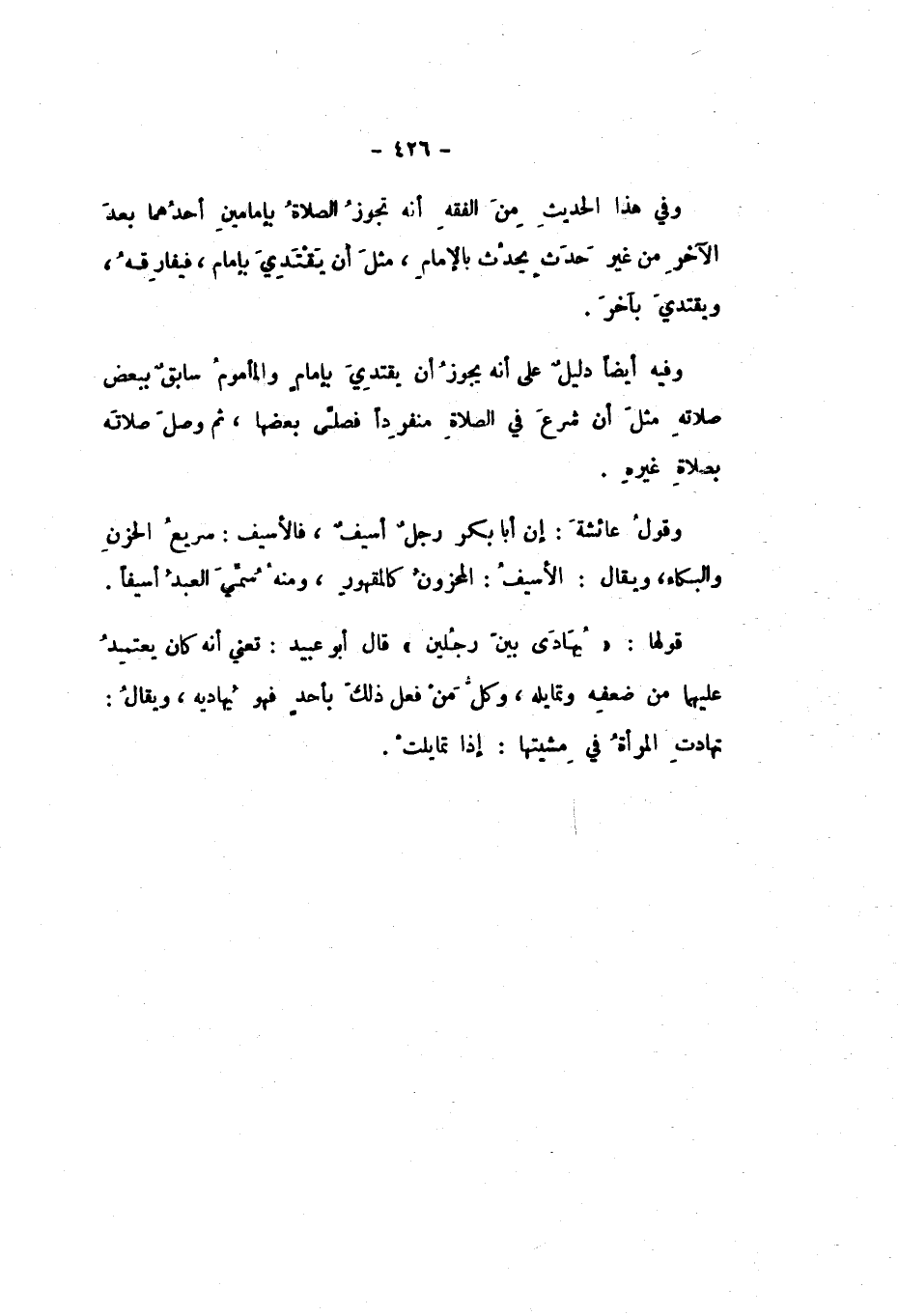 وَفِي هَذَا الْحَدِيثِ مِنَ الْفِقْهِ، أَنَّهُ تَجُوزُ الصَّلاةُ بِإِمَامَيْنِ، أَحَدُهُمَا بَعْدَ الآخَرِ مِنْ غَيْرِ حَدَثَ يَحْدُثُ بِالإِمَامِ، مِثْلَ أَنْ يَقْتَدِيَ بِإِمَامٍ فَيُفَارِقُهُ، وَيَقْتَدِيَ بِآخَرَ.