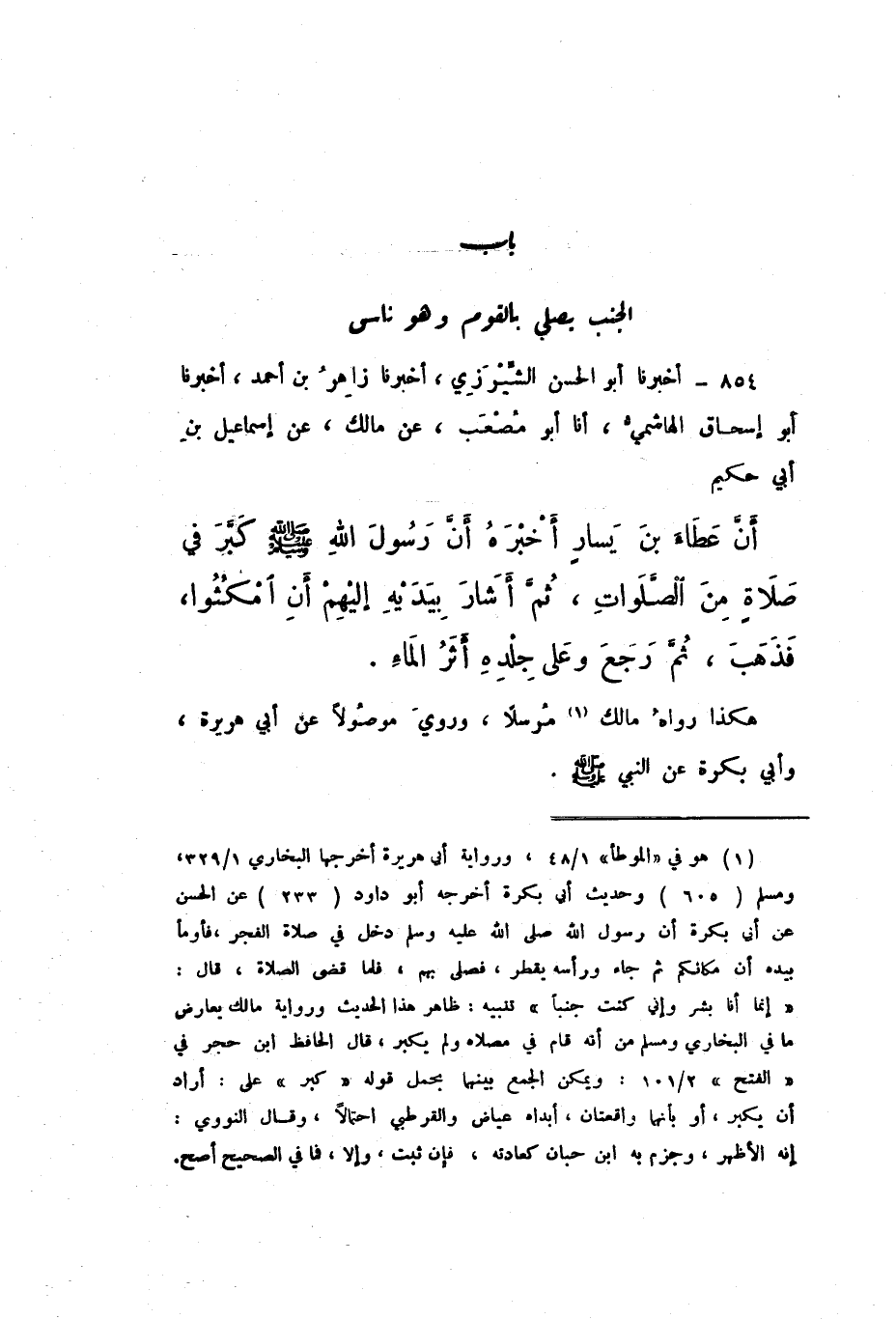 854 - أَخْبَرَنَا أَبُو الْحَسَنِ الشِّيرَزِيُّ، أَخْبَرَنَا زَاهِرُ بْنُ أَحْمَدَ، أَخْبَرَنَا أَبُو إِسْحَاقَ الْهَاشِمِيُّ، أَنَا أَبُو مُصْعَبٍ، عَنْ مَالِكٍ، عَنْ إِسْمَاعِيلَ بْنِ أَبِي حَكِيمٍ، أَنَّ عَطَاءَ بْنَ يَسَارٍ، أَخْبَرَهُ «أَنَّ رَسُولَ اللَّهِ صَلَّى اللهُ عَلَيْهِ وَسَلَّمَ كَبَّرَ فِي صَلاةٍ مِنَ الصَّلَوَاتِ، ثُمَّ أَشَارَ بِيَدَيْهِ إِلَيْهِمْ أَنِ امْكُثُوا، فَذَهَبَ، ثُمَّ رَجَعَ وَعَلَى جِلْدِهِ أَثَرُ الْمَاءِ».