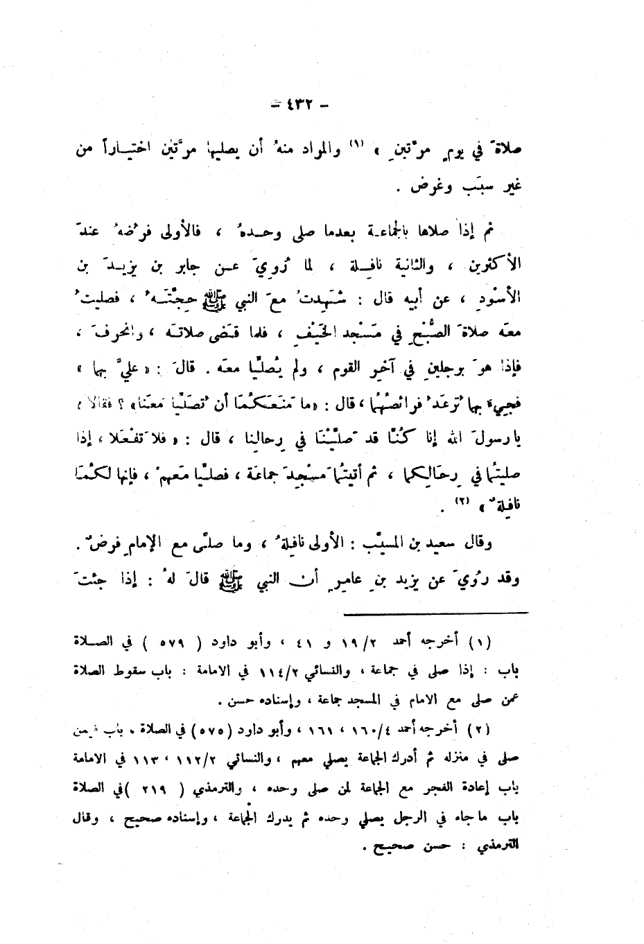 ثُمَّ إِذَا صَلاهَا بِالْجَمَاعَةِ بَعْدَمَا صَلَّى وَحْدَهُ، فَالأَوْلَى فَرْضُهُ عِنْدَ الأَكْثَرِينَ، وَالثَّانِيَةُ نَافِلَةٌ، لِمَا رُوِيَ عَنْ جَابِرِ بْنِ يَزِيدَ بْنِ الأَسْوَدِ، عَنْ أَبِيهِ، قَالَ: شَهِدْتُ مَعَ النَّبِيِّ صَلَّى اللهُ عَلَيْهِ وَسَلَّمَ حجَّتَهُ، فَصَلَّيْتُ مَعَهُ صَلاةَ الصُّبْحِ فِي مَسْجِدِ الْخَيْفِ، فَلَمَّا قَضَى صَلاتَهُ، وَانْحَرَفَ، فَإِذَا هُوَ بِرَجُلَيْنِ فِي آخِرِ الْقَوْمِ، وَلَمْ يُصَلِّيَا مَعَهُ، قَالَ: «عَلَيَّ بِهِمَا» فَجِيءَ بِهِمَا تُرْعَدُ فَرَائِصُهُمَا، قَالَ: «مَا مَنَعَكُمَا أَنْ تُصَلِّيَا مَعَنَا»؟ فَقَالا: يَا رَسُولَ اللَّهِ، إِنَّا كُنَّا قَدْ صَلَّيْنَا فِي رِحَالِنَا، قَالَ: «فَلا تَفْعَلا، إِذَا صَلَّيْتُمَا فِي رِحَالِكُمَا، ثُمَّ أَتَيْتُمَا مَسْجِدَ جَمَاعَةٍ، فَصَلِّيَا مَعَهُمْ، فَإِنَّهُمَا لَكُمَا نَافِلَةٌ».