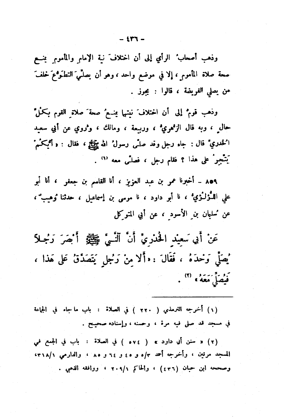 وَذَهَبَ قَوْمٌ إِلَى أَنَّ اخْتِلافَ نِيَّتِهِمَا يَمْنَعُ صِحَّةَ صَلاةِ الْقَوْمِ بِكُلِّ حَالٍ، وَبِهِ قَالَ الزُّهْرِيُّ، وَرَبِيعَةُ، وَمَالِكٌ، وَرُوِيَ عَنْ أَبِي سَعِيدٍ الْخُدْرِيِّ، قَالَ: جَاءَ رَجُلٌ وَقَدْ صَلَّى رَسُولُ اللَّهِ صَلَّى اللهُ عَلَيْهِ وَسَلَّمَ، فَقَالَ: «أَيُّكُمْ يَتَّجِرُ عَلَى هَذَا»؟ فَقَامَ رَجُلٌ، فَصَلَّى مَعَهُ.
