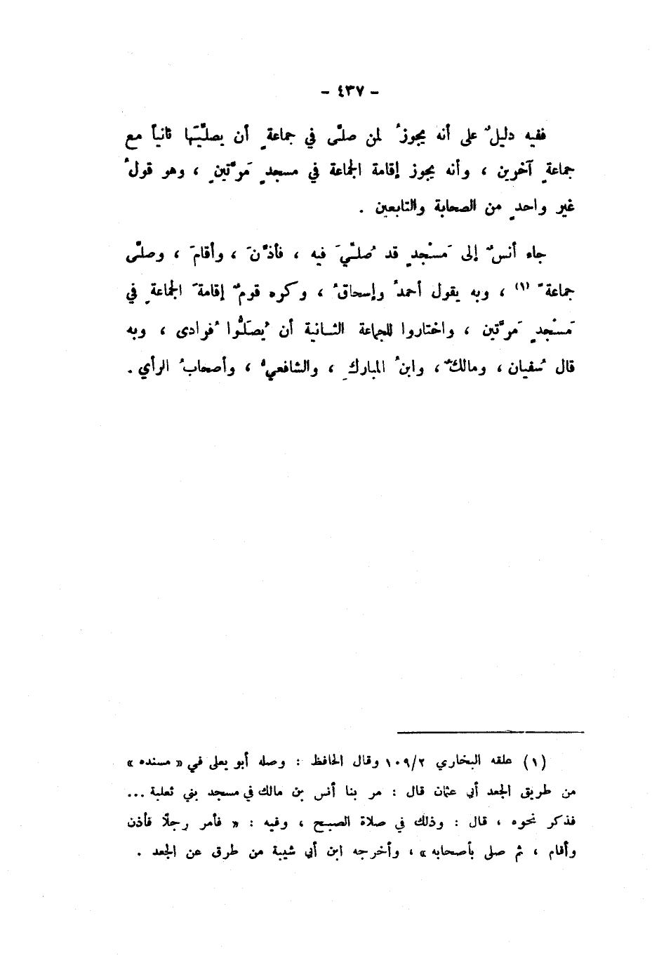 جَاءَ أَنَسٌ إِلَى مَسْجِدٍ قَدْ صُلِّيَ فِيهِ، فَأَذَّنَ، وَأَقَامَ، وَصَلَّى جَمَاعَةً، وَبِهِ يَقُولُ أَحْمَدُ وَإِسْحَاقُ، وَكَرِهَ قَوْمٌ إِقَامَةَ الْجَمَاعَةِ فِي مَسْجِدٍ مَرَّتَيْنِ، وَاخْتَارُوا لِلْجَمَاعَةِ الثَّانِيَةِ أَنْ يُصَلُّوا فُرَادَى، وَبِهِ قَالَ سُفْيَانُ، وَمَالِكٌ، وَابْنُ الْمُبَارَكِ، وَالشَّافِعِيُّ، وَأَصْحَابُ الرَّأْيِ.