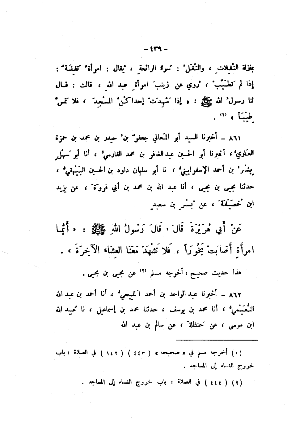 861 - أَخْبَرَنَا السَّيِّدُ أَبُو الْمَعَالِي جَعْفَرُ بْنُ حَيْدَرِ بْنِ مُحَمَّدِ بْنِ حَمْزَةَ الْعَلَوِيُّ، أَخْبَرَنَا أَبُو الْحُسَيْنِ عَبْدُ الْغَافِرِ بْنُ مُحَمَّدٍ الْفَارِسِيُّ، أَنَا أَبُو سَهْلٍ بِشْرُ بْنُ أَحْمَدَ الإِسْفَرَايِينِيُّ، نَا أَبُو سُلَيْمَانَ دَاوُدُ بْنُ الْحُسَيْنِ الْبَيْهَقِيُّ، حَدَّثَنَا يَحْيَى بْنُ يَحْيَى، أَنَا عَبْدُ اللَّهِ بْنُ مُحَمَّدِ بْنِ أَبِي فَرْوَةَ، عَنْ يَزِيدَ بْنِ خُصَيْفَةَ، عَنْ بُسْرِ بْنِ سَعِيدٍ، عَنْ أَبِي هُرَيْرَةَ، قَالَ: قَالَ رَسُولُ اللَّهِ صَلَّى اللهُ عَلَيْهِ وَسَلَّمَ: «أَيُّمَا امْرَأَةٍ أَصَابَتْ بَخُورًا، فَلا تَشْهَدْ مَعَنَا الْعِشَاءَ الآخِرَةَ».