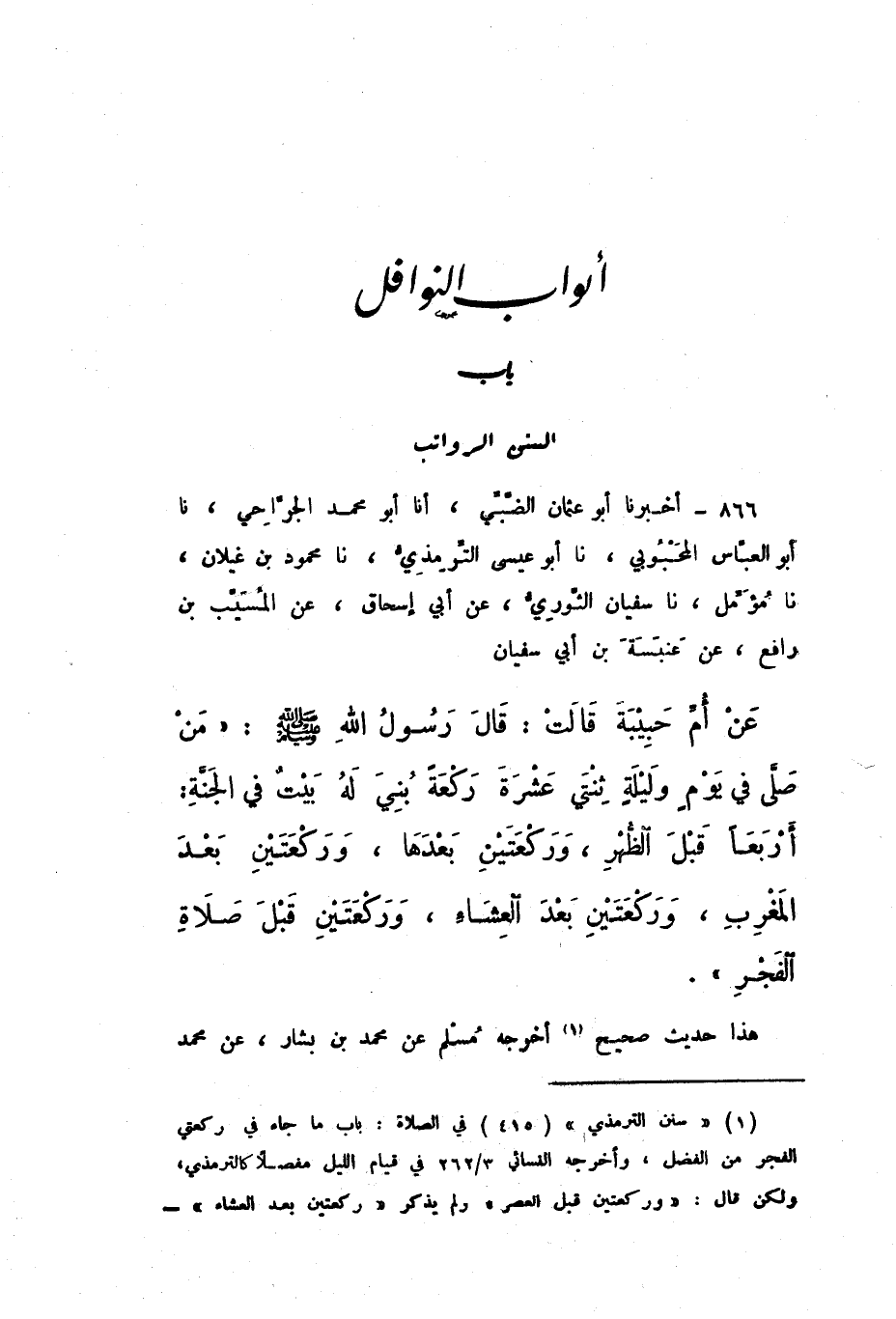 866 - أَخْبَرَنَا أَبُو عُثْمَانَ الضَّبِّيُّ، أَنَا أَبُو مُحَمَّدٍ الْجَرَّاحِيُّ، نَا أَبُو الْعَبَّاسِ الْمَحْبُوبِيُّ، نَا أَبُو عِيسَى التِّرْمِذِيُّ، نَا مَحْمُودُ بْنُ غَيْلانَ، نَا مُؤَمَّلٌ، نَا سُفْيَانُ الثَّوْرِيُّ، عَنْ أَبِي إِسْحَاقَ، عَنِ الْمُسَيَّبِ بْنِ رَافِعٍ، عَنْ عَنْبَسَةَ بْنِ أَبِي سُفْيَانَ، عَنْ أُمِّ حَبِيبَةَ، قَالَتْ: قَالَ رَسُولُ اللَّهِ صَلَّى اللهُ عَلَيْهِ وَسَلَّمَ: " مَنْ صَلَّى فِي يَوْمٍ وَلَيْلَةٍ ثِنْتَيْ عَشْرَةَ رَكْعَةً بُنِيَ لَهُ بَيْتٌ فِي الْجَنَّةِ: أَرْبَعًا قَبْلَ الظُّهْرِ، وَرَكْعَتَيْنِ بَعْدَهَا، وَرَكْعَتَيْنِ بَعْدَ الْمَغْرِبِ، وَرَكْعَتَيْنِ بَعْدَ الْعِشَاءِ، وَرَكْعَتَيْنِ قَبْلَ صَلاةِ الْفَجْرِ ".