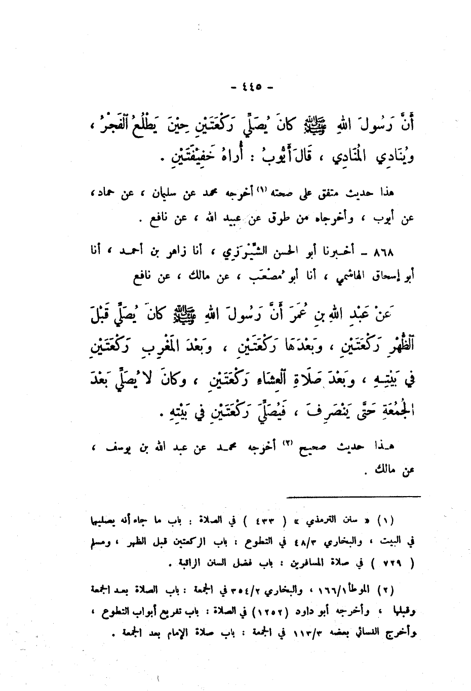 868 - أَخْبَرَنَا أَبُو الْحَسَنِ الشِّيرَزِيُّ، أَنَا زَاهِرُ بْنُ أَحْمَدَ، أَنَا أَبُو إِسْحَاقَ الْهَاشِمِيُّ، أَنَا أَبُو مُصْعَبٍ، عَنْ مَالِكٍ، عَنْ نَافِعٍ، عَنْ عَبْدِ اللَّهِ بْنِ عُمَرَ، أَنَّ رَسُولَ اللَّهِ صَلَّى اللهُ عَلَيْهِ وَسَلَّمَ «كَانَ يُصَلِّي قَبْلَ الظُّهْرِ رَكْعَتَيْنِ، وَبَعْدَهَا رَكْعَتَيْنِ، وَبَعْدَ الْمَغْرِبِ رَكْعَتَيْنِ فِي بَيْتِهِ، وَبَعْدَ صَلاةِ الْعِشَاءِ رَكْعَتَيْنِ، وَكَانَ لَا يُصَلِّي بَعْدَ الْجُمُعَةِ حَتَّى يَنْصَرِفَ، فَيُصَلِّي رَكْعَتَيْنِ فِي بَيْتِهِ».