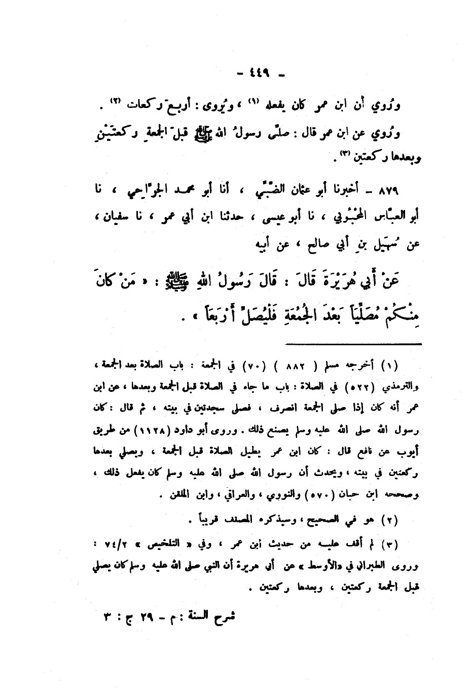 879 - أَخْبَرَنَا أَبُو عُثْمَانَ الضَّبِّيُّ، أَنَا أَبُو مُحَمَّدٍ الْجَرَّاحِيُّ، نَا أَبُو الْعَبَّاسِ الْمَحْبُوبِيُّ، نَا أَبُو عِيسَى، حَدَّثَنَا ابْنُ أَبِي عُمَرَ، نَا سُفْيَانُ، عَنْ سُهَيْلِ بْنِ أَبِي صَالِحٍ، عَنْ أَبِيهِ، عَنْ أَبِي هُرَيْرَةَ، قَالَ: قَالَ رَسُولُ اللَّهِ صَلَّى اللهُ عَلَيْهِ وَسَلَّمَ: «مَنْ كَانَ مِنْكُمْ مُصَلِّيًا بَعْدَ الْجُمُعَةِ فَلْيُصَلِّ أَرْبَعًا».
