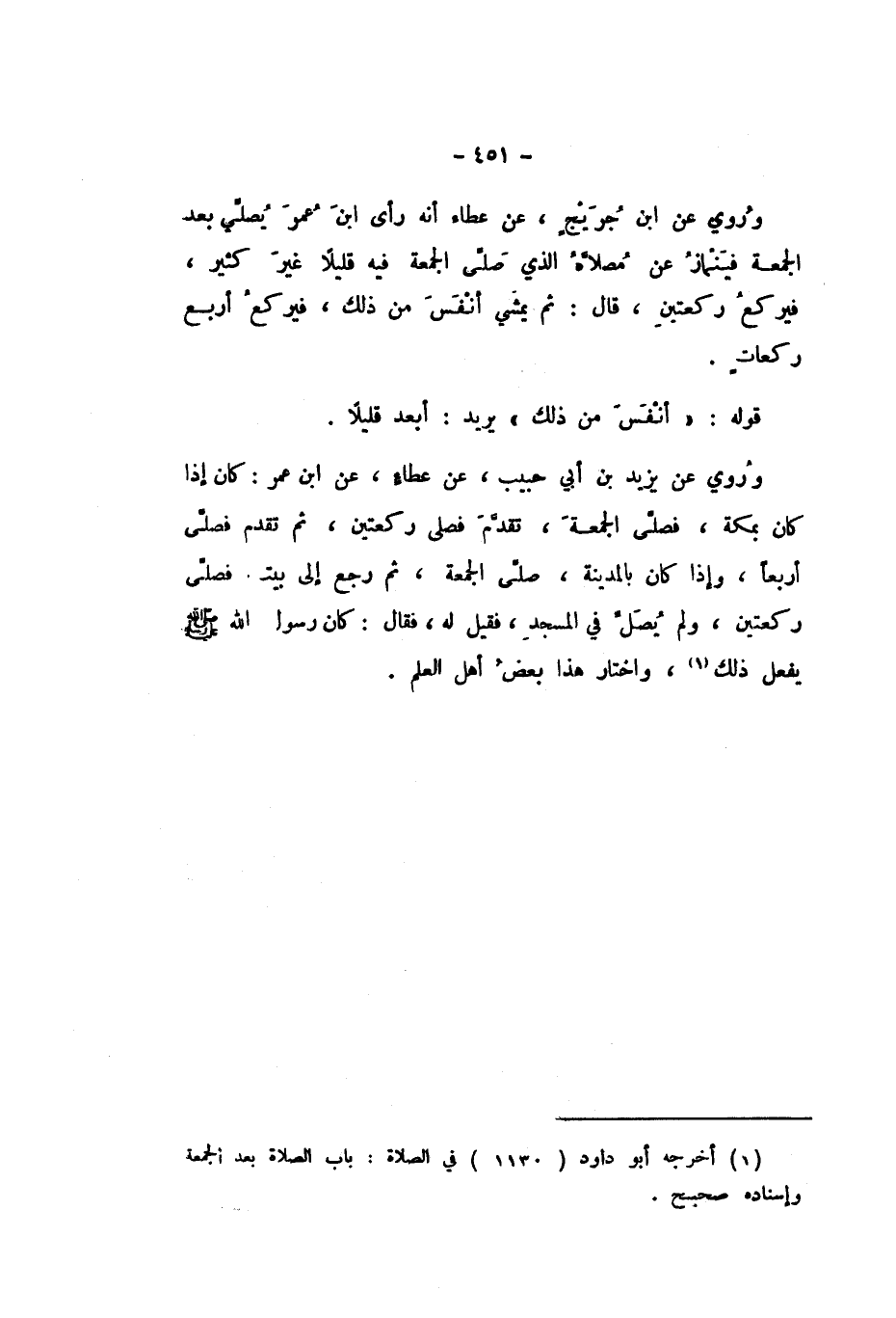 وَرُوِيَ عَنْ يَزِيدَ بْنِ أَبِي حَبِيبٍ، عَنْ عَطَاءٍ، عَنِ ابْنِ عُمَرَ: " كَانَ إِذَا كَانَ بِمَكَّةَ، فَصَلَّى الْجُمُعَةَ، تَقَدَّمَ فَصَلَّى رَكْعَتَيْنِ، ثُمَّ تَقَدَّمَ فَصَلَّى أَرْبَعًا، وَإِذَا كَانَ بِالْمَدِينَةِ، صَلَّى الْجُمُعَةَ، ثُمَّ رَجَعَ إِلَى بَيْتِهِ فَصَلَّى رَكْعَتَيْنِ، وَلَمْ يُصَلِّ فِي الْمَسْجِدِ، فَقِيلَ لَهُ، فَقَالَ: كَانَ رَسُولُ اللَّهِ صَلَّى اللهُ عَلَيْهِ وَسَلَّمَ يَفْعَلُ ذَلِكَ ".