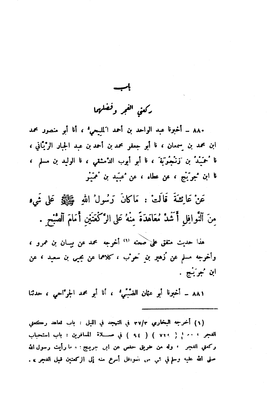 880 - أَخْبَرَنَا عَبْدُ الْوَاحِدِ بْنُ أَحْمَدَ الْمَلِيحِيُّ، أَنَا أَبُو مَنْصُورٍ مُحَمَّدُ بْنُ مُحَمَّدِ بنِ سمْعَانَ، نَا أَبُو جَعْفَرٍ مُحَمَّدُ بْنُ أَحْمَدَ بْنِ عَبْدِ الْجَبَّارِ الرَّيَّانِيُّ، نَا حُمَيْدُ بْنُ زَنْجُوَيْهِ، نَا أَبُو أَيُّوبَ الدِّمَشْقِيُّ، نَا الْوَلِيدُ بْنُ مُسْلِمٍ، نَا ابْنُ جُرَيْجٍ، عَنْ عَطَاءٍ، عَنْ عُبَيْدِ بْنِ عُمَيْرٍ، عَنْ عَائِشَةَ، قَالَتْ: «مَا كَانَ رَسُولُ اللَّهِ صَلَّى اللهُ عَلَيْهِ وَسَلَّمَ عَلَى شَيْءٍ مِنَ النَّوَافِلِ أَشَدَّ مُعَاهَدَةً مِنْهُ عَلَى الرَّكْعَتَيْنِ أَمَامَ الصُّبْحِ».