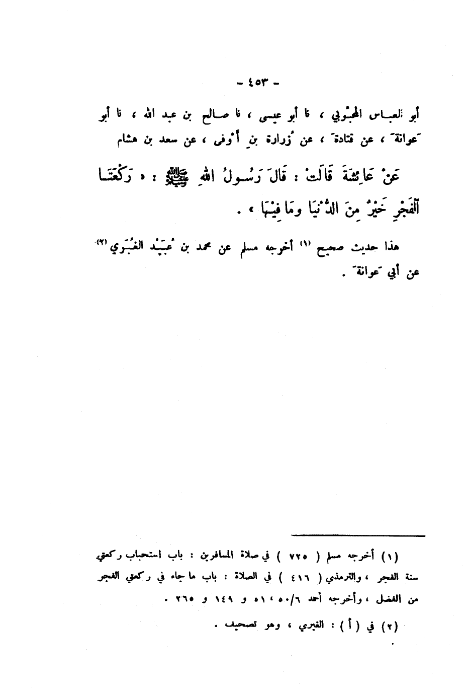 أَبُو الْعَبَّاسِ الْمَحْبُوبِيُّ، نَا أَبُو عِيسَى، نَا صَالِحُ بْنُ عَبْدِ اللَّهِ، نَا أَبُو عَوَانَةَ، عَنْ قَتَادَةَ، عَنْ زُرَارَةَ بْنِ أَوْفَى، عَنْ سَعْدِ بْنِ هِشَامٍ، عَنْ عَائِشَةَ، قَالَتْ: قَالَ رَسُولُ اللَّهِ صَلَّى اللهُ عَلَيْهِ وَسَلَّمَ: «رَكْعَتَا الْفَجْرِ خَيْرٌ مِنَ الدُّنْيَا وَمَا فِيهَا».