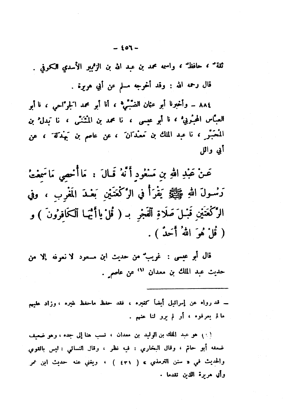 884 - وَأَخْبَرَنَا أَبُو عُثْمَانَ الضَّبِّيُّ، أَنَا أَبُو مُحَمَّدٍ الْجَرَّاحِيُّ، نَا أَبُو الْعَبَّاسِ الْمَحْبُوبِيُّ، نَا أَبُو عِيسَى، نَا مُحَمَّدُ بْنُ الْمُثَنَّى، نَا بدل بْنُ الْمُحَبَّرِ، نَا عَبْدُ الْمَلِكِ بْنُ مَعْدَانَ، عَنْ عَاصِمِ بْنِ بَهْدَلَةَ، عَنْ أَبِي وَائِلٍ، عَنْ عَبْدِ اللَّهِ بْنِ مَسْعُودٍ، أَنَّهُ قَالَ: مَا أُحْصِي مَا سَمِعْتُ رَسُولَ اللَّهِ صَلَّى اللهُ عَلَيْهِ وَسَلَّمَ «يَقْرَأُ فِي الرَّكْعَتَيْنِ بَعْدَ الْمَغْرِبِ، وَفِي الرَّكْعَتَيْنِ قَبْلَ صَلاةِ الْفَجْرِ بِـ قُلْ يَأَيُّهَا الْكَافِرُونَ، وَقُلْ هُوَ اللَّهُ أَحَدٌ».