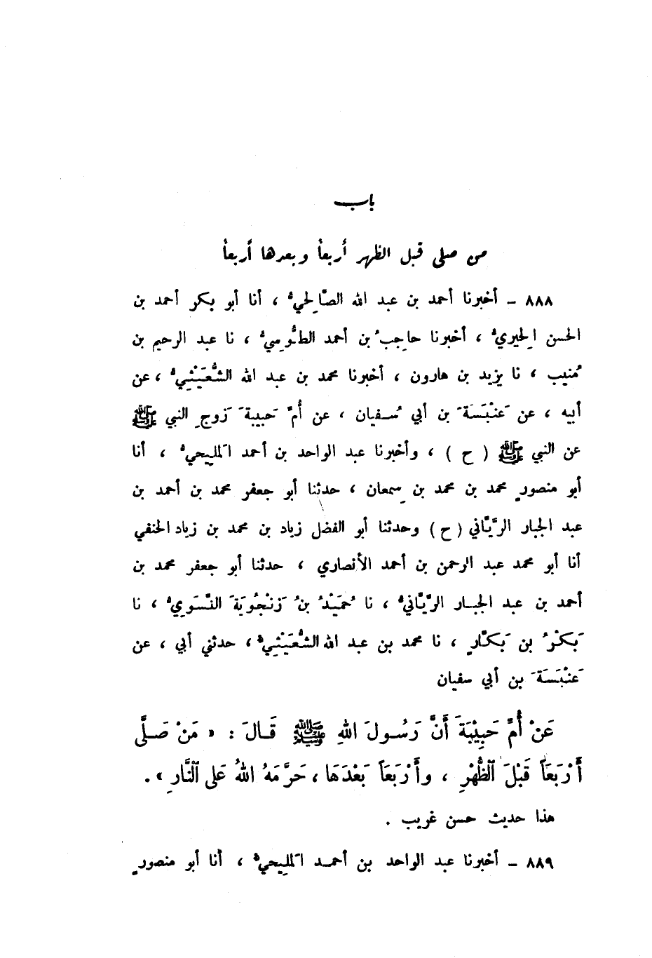 888 - أَخْبَرَنَا أَحْمَدُ بْنُ عَبْدِ اللَّهِ الصَّالِحِيُّ، أَنَا أَبُو بَكْرٍ أَحْمَدُ بْنُ الْحَسَنِ الْحِيرِيُّ، أَخْبَرَنَا حَاجِبُ بْنُ أَحْمَدَ الطُّوسِيُّ، نَا عَبْدُ الرَّحِيمِ بْنُ مُنِيبٍ، نَا يَزِيدُ بْنُ هَارُونَ، أَخْبَرَنَا مُحَمَّدُ بْنُ عَبْدِ اللَّهِ الشُّعَيْثِيُّ، عَنْ أَبِيهِ، عَنْ عَنْبَسَةَ بْنِ أَبِي سُفْيَانَ، عَنْ أُمِّ حَبِيبَةَ، زَوْجِ النَّبِيِّ صَلَّى اللهُ عَلَيْهِ وَسَلَّمَ، عَنِ النَّبِيِّ صَلَّى اللهُ عَلَيْهِ وَسَلَّمَ.