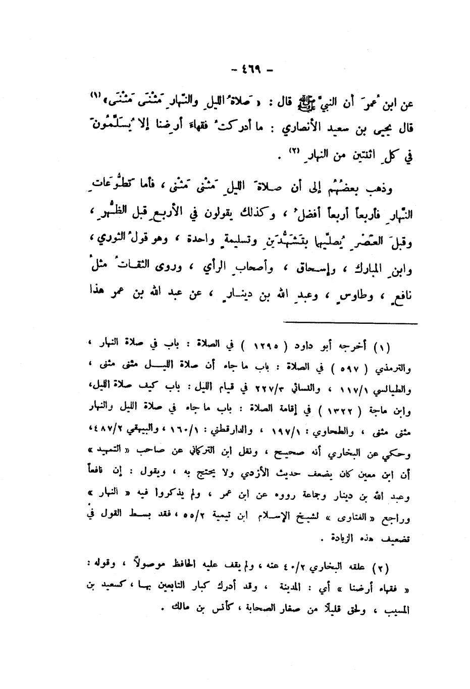 عَنِ ابْنِ عُمَرَ، أَنَّ النَّبِيَّ صَلَّى اللهُ عَلَيْهِ وَسَلَّمَ، قَالَ: «صَلاةُ اللَّيْلِ وَالنَّهَارِ مَثْنَى مَثْنَى».