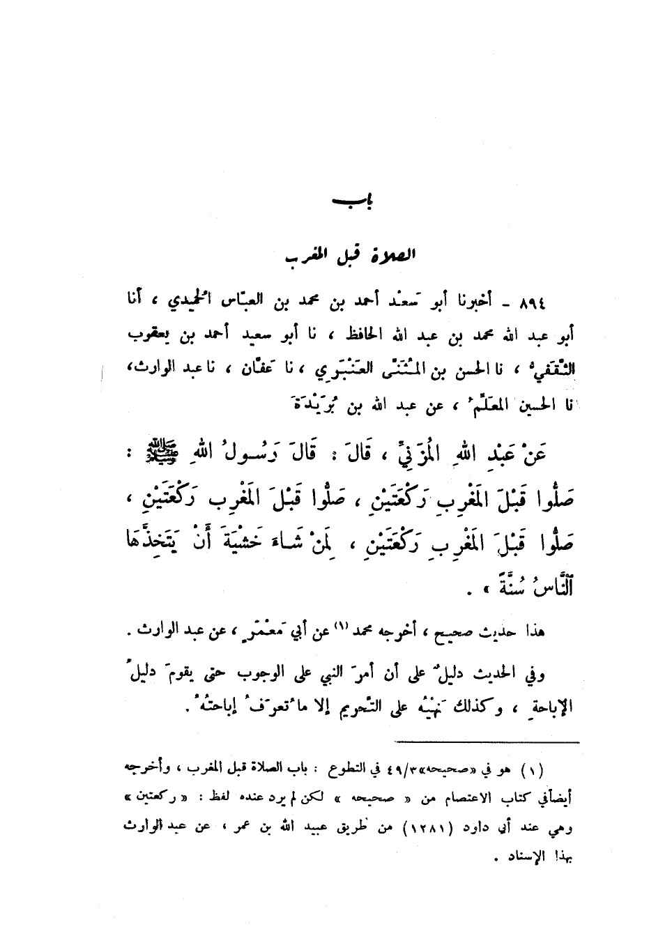 894 - أَخْبَرَنَا أَبُو سَعْدٍ أَحْمَدُ بْنُ مُحَمَّدِ بْنِ الْعَبَّاسِ الْحُمَيْدِيُّ، أَنَا أَبُو عَبْدِ اللَّهِ مُحَمَّدُ بْنُ عَبْدِ اللَّهِ الْحَافِظُ، نَا أَبُو سَعِيدٍ أَحْمَدُ بْنُ يَعْقُوبَ الثَّقَفِيُّ، نَا الْحَسَنُ بْنُ الْمُثَنَّى الْعَنْبَرِيُّ، نَا عَفَّانُ، نَا عَبْدُ الْوَارِثِ، نَا الْحُسَيْنُ الْمُعَلِّمُ، عَنْ عَبْدِ اللَّهِ بْنِ بُرَيْدَةَ، عَنْ عَبْدِ اللَّهِ الْمُزَنِيِّ، قَالَ: قَالَ رَسُولُ اللَّهِ صَلَّى اللهُ عَلَيْهِ وَسَلَّمَ: «صَلُّوا قَبْلَ الْمَغْرِبِ رَكْعَتَيْنِ، صَلُّوا قَبْلَ الْمَغْرِبِ رَكْعَتَيْنِ، صَلُّوا قَبْلَ الْمَغْرِبِ رَكْعَتَيْنِ، لِمَنْ شَاءَ خَشْيَةَ أَنْ يَتَّخِذَهَا النَّاسُ سُنَّةً».