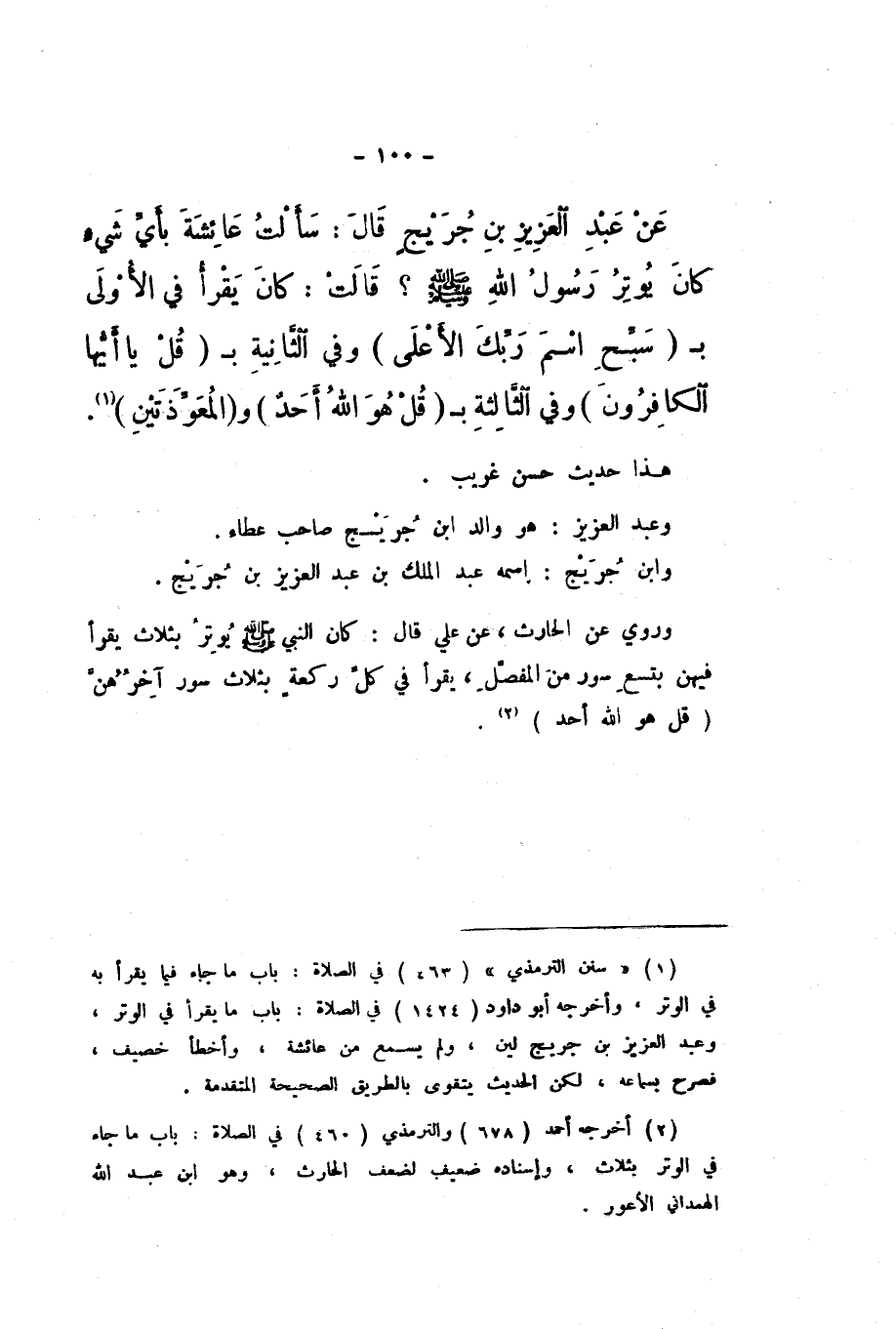 عَنْ عَبْدِ الْعَزِيزِ بْنِ جُرَيْجٍ، قَالَ: سَأَلْتُ عَائِشَةَ بِأَيِّ شَيْءٍ كَانَ يُوتِرُ رَسُولُ اللَّهِ صَلَّى اللهُ عَلَيْهِ وَسَلَّمَ؟ قَالَتْ: «كَانَ يَقْرَأُ فِي الأُولَى بِـ سَبِّحِ اسْمَ رَبِّكَ الأَعْلَى وَفِي الثَّانِيَةِ بِـ قُلْ يَأَيُّهَا الْكَافِرُونَ وَفِي الثَّالِثَةِ بِـ قُلْ هُوَ اللَّهُ أَحَدٌ وَالْمُعَوِّذَتَيْنِ».