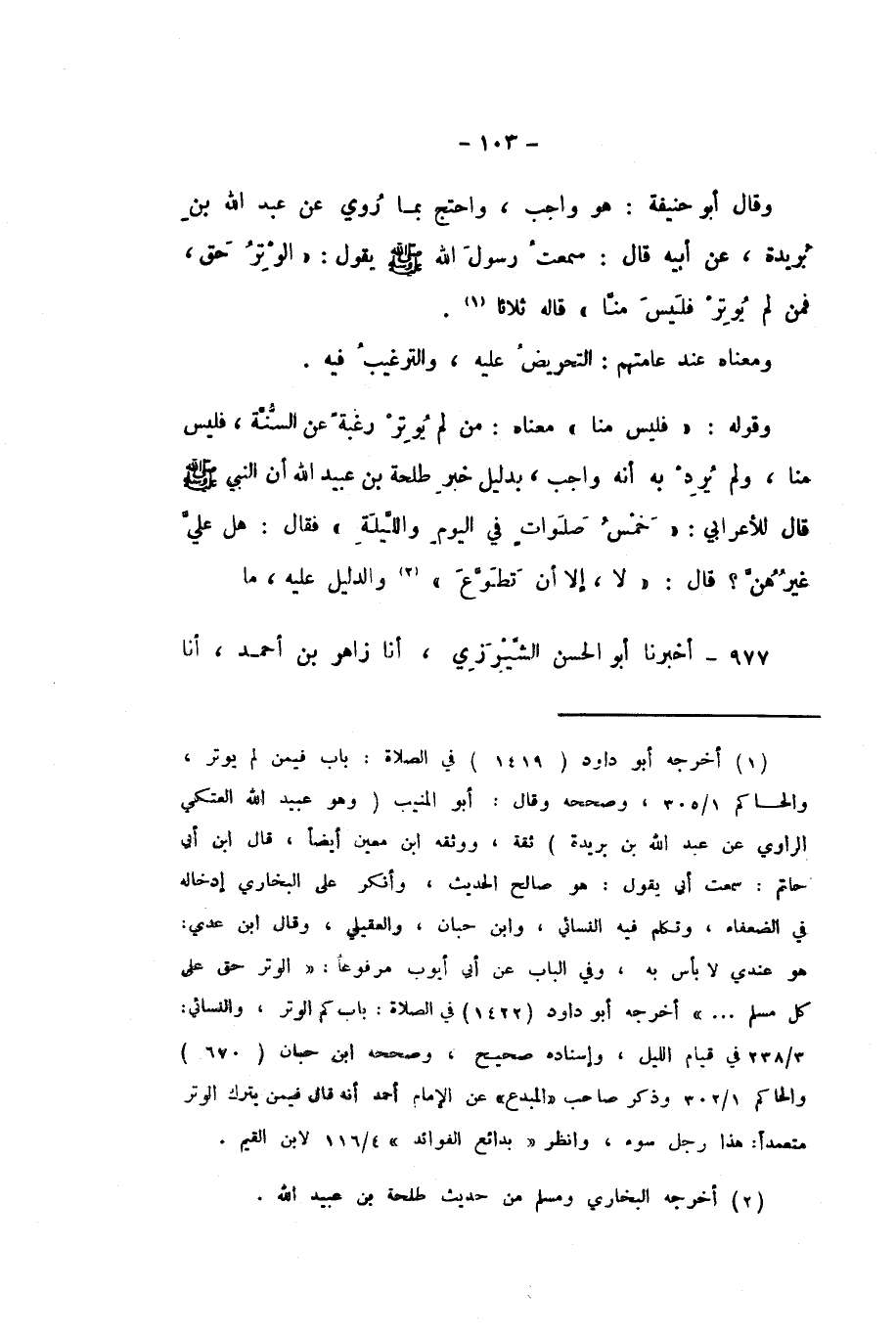 وَقَوْلُهُ: «فَلَيْسَ مِنَّا» مَعْنَاهُ: مَنْ لَمْ يُوتِرْ رَغْبَةً عَنِ السُّنَّةِ، فَلَيْسَ مِنَّا، وَلَمْ يُرِدْ بِهِ أَنَّهُ وَاجِبٌ، بِدَلِيلِ خَبَرِ طَلْحَةَ بْنِ عُبَيْدِ اللَّهِ، أَنَّ النَّبِيَّ صَلَّى اللهُ عَلَيْهِ وَسَلَّمَ، قَالَ لِلأَعْرَابِيِّ: «خَمْسُ صَلَوَاتٍ فِي الْيَوْمِ وَاللَّيْلَةِ»، فَقَالَ: هَلْ عَلَيَّ غَيْرُهُنَّ؟ قَالَ: «لَا، إِلا أَنْ تَطَوَّعَ» وَالدَّلِيلُ عَلَيْهِ، مَا: