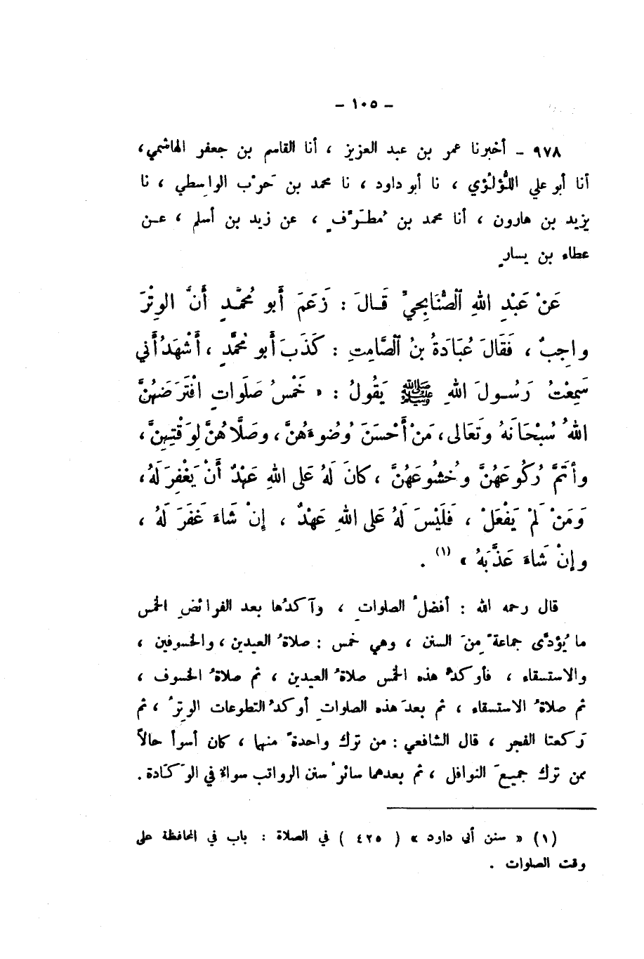 978 - أَخْبَرَنَا عُمَرُ بْنُ عَبْدِ الْعَزِيزِ، أَنا الْقَاسِمُ بْنُ جَعْفَرٍ الْهَاشِمِيُّ، أَنا أَبُو عَلِيٍّ اللُّؤْلُئِيُّ، نَا أَبُو دَاوُدَ، نَا مُحَمَّدُ بْنُ حَرْبٍ الْوَاسِطِيُّ، نَا يَزِيدُ بْنُ هَارُونَ، أَنا مُحَمَّدُ بْنُ مُطَرِّفٍ، عَنْ زَيْدِ بْنِ أَسْلَمَ، عَنْ عَطَاءِ بْنِ يَسَارٍ، عَنْ عَبْدِ اللَّهِ الصُّنَابِحِيِّ، قَالَ: زَعَمَ أَبُو مُحَمَّدٍ أَنَّ الْوِتْرَ وَاجِبٌ، فَقَالَ عُبَادَةُ بْنُ الصَّامِتِ: كَذَبَ أَبُو مُحَمَّدٍ، أَشْهَدُ أَنِّي سَمِعْتُ رَسُولَ اللَّهِ صَلَّى اللهُ عَلَيْهِ وَسَلَّمَ، يَقُولُ: «خَمْسُ صَلَوَاتٍ افْتَرَضَهُنَّ اللَّهُ سُبْحَانَهُ وَتَعَالَى، مَنْ أَحْسَنَ وُضُوءَهُنَّ، وَصَلاهُنَّ لِوَقْتِهِنَّ، وَأَتَمَّ رُكُوعَهُنَّ وَخُشُوعَهُنَّ، كَانَ لَهُ عَلَى اللَّهِ عَهْدٌ أَنْ يَغْفِرَ لَهُ، وَمَنْ لَمْ يَفْعَلْ، فَلَيْسَ لَهُ عَلَى اللَّهِ عَهْدٌ، إِنْ شَاءَ غَفَرَ لَهُ، وَإِنْ شَاءَ عَذَّبَهُ»