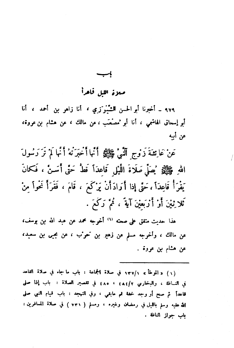 979 - أَخْبَرَنَا أَبُو الْحَسَنِ الشِّيرَزِيُّ، أَنا زَاهِرُ بْنُ أَحْمَدَ، أَنا أَبُو إِسْحَاقَ الْهَاشِمِيُّ، أَنا أَبُو مُصْعَبٍ، عَنْ مَالِكٍ، عَنْ هِشَامِ بْنِ عُرْوَةَ، عَنْ أَبِيهِ، عَنْ عَائِشَةَ زَوْجِ النَّبِيِّ صَلَّى اللهُ عَلَيْهِ وَسَلَّمَ، أَنَّهَا أَخْبَرَتْهُ، أَنَّهَا «لَمْ تَرَ رَسُولَ اللَّهِ صَلَّى اللهُ عَلَيْهِ وَسَلَّمَ يُصَلِّي صَلاةَ اللَّيْلِ قَاعِدًا قَطُّ حَتَّى أَسَنَّ، فَكَانَ يَقْرَأُ قَاعِدًا، حَتَّى إِذَا أَرَادَ أَنْ يَرْكَعَ، قَامَ، فَقَرَأَ نَحْوًا مِنْ ثَلاثِينَ أَوْ أَرْبَعِينَ آيَةً، ثُمَّ رَكَعَ».