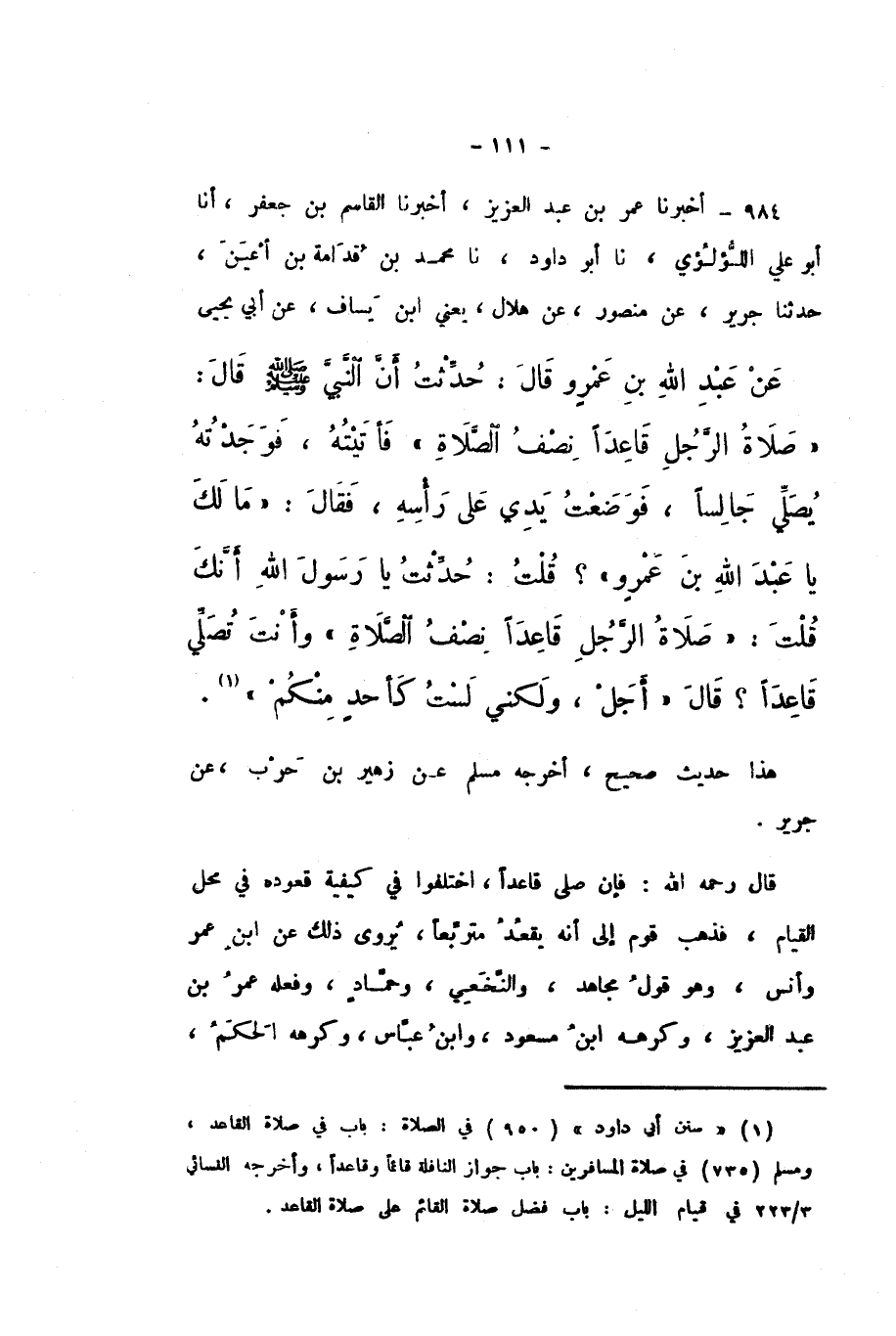 984 - أَخْبَرَنَا عُمَرُ بْنُ عَبْدِ الْعَزِيزِ، أَخْبَرَنَا الْقَاسِمُ بْنُ جَعْفَرٍ، أَنا أَبُو عَلِيٍّ اللُّؤْلُئِيُّ، نَا أَبُو دَاوُدَ، نَا مُحَمَّدُ بْنُ قُدَامَةَ بْنِ أَعْيَنَ، حَدَّثَنَا جَرِيرٌ، عَنْ مَنْصُورٍ، عَنْ هِلالٍ، يَعْنِي ابْنَ يَسَافٍ، عَنْ أَبِي يَحْيَى، عَنْ عَبْدِ اللَّهِ بْنِ عَمْرٍو، قَالَ: حُدِّثْتُ أَنَّ النَّبِيَّ صَلَّى اللهُ عَلَيْهِ وَسَلَّمَ، قَالَ: «صَلاةُ الرَّجُلِ قَاعِدًا نِصْفُ الصَّلاةِ» فَأَتَيْتُهُ، فَوَجَدْتُهُ يُصَلِّي جَالِسًا، فَوَضَعْتُ يَدِي عَلَى رَأْسِهِ، فَقَالَ: «مَا لَكَ يَا عَبْدَ اللَّهِ بْنَ عَمْرٍو؟»، قُلْتُ: حُدِّثْتُ يَا رَسُولَ اللَّهِ أَنَّكَ، قُلْتَ: «صَلاةُ الرَّجُلِ قَاعِدًا نِصْفُ الصَّلاةِ» وَأَنْتَ تُصَلِّي قَاعِدًا؟ قَالَ: «أَجَلْ، وَلَكِنِّي لَسْتُ كَأَحَدٍ مِنْكُمْ».
