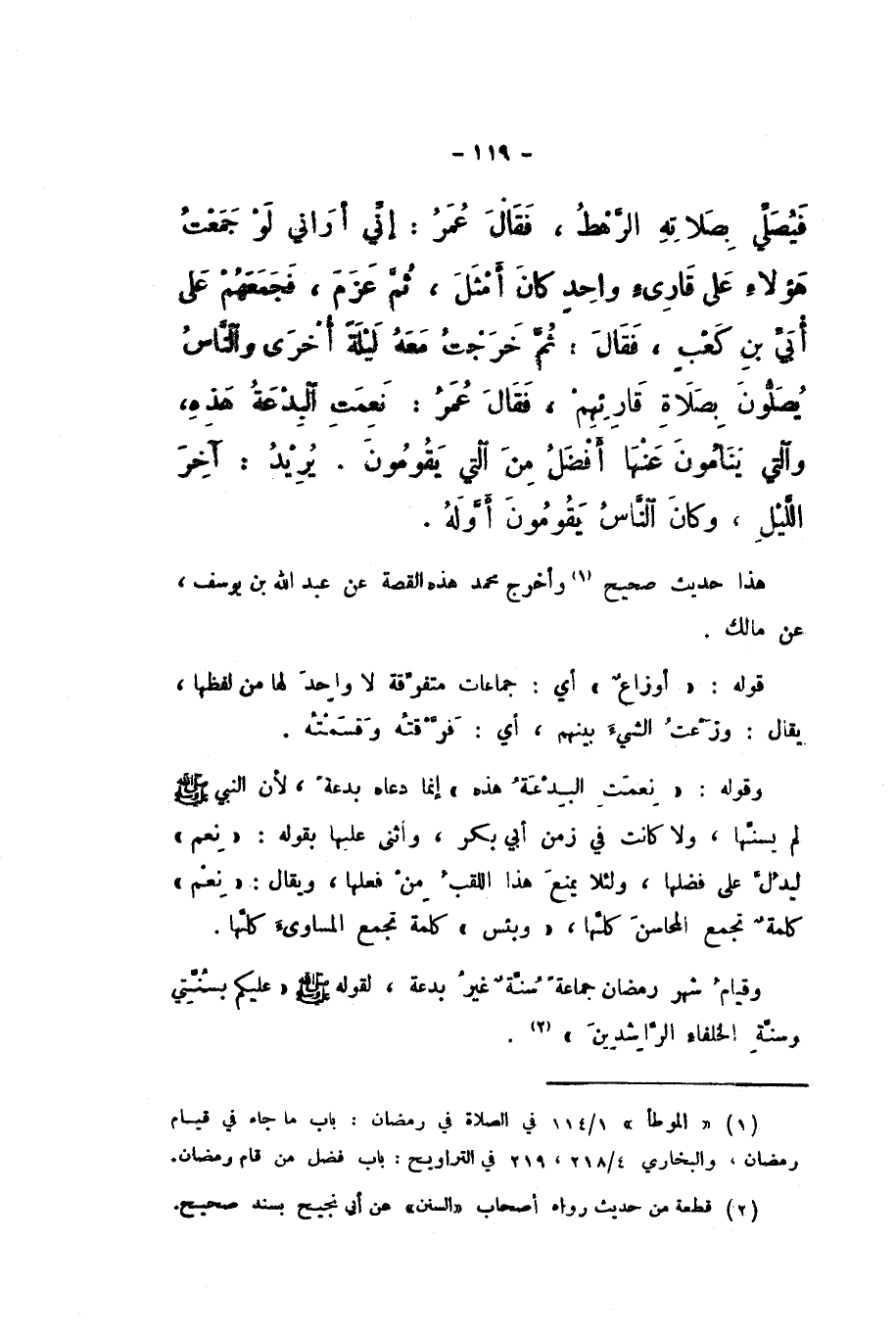 وَقَوْلُهُ: «نِعْمَتِ الْبِدْعَةُ هَذِهِ» إِنَّمَا دَعَاهُ بِدْعَةً، لأَنَّ النَّبِيَّ صَلَّى اللهُ عَلَيْهِ وَسَلَّمَ لَمْ يَسُنَّهَا، وَلا كَانَتْ فِي زَمَنِ أَبِي بَكْرٍ، وَأَثْنَى عَلَيْهَا بِقَوْلِهِ: «نِعْمَ» لِيَدُلَّ عَلَى فَضْلِهَا، وَلِئَلا يَمْنَعُ هَذَا اللَّقَبُ مِنْ فِعْلِهَا، وَيُقَالُ: «نِعْمَ» كَلِمَةٌ تَجْمَعُ الْمَحَاسِنَ كُلَّهَا، «وَبِئْسَ» كَلِمَةٌ تَجْمَعُ الْمَسَاوِئَ كُلَّهَا.