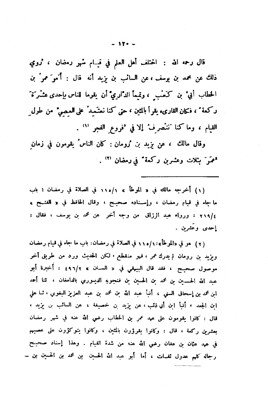 قَالَ رَحِمَهُ اللَّهُ: اخْتَلَفَ أَهْلُ الْعِلْمِ فِي قِيَامِ شَهْرِ رَمَضَانَ، رُوِيَ ذَلِكَ عَنْ مُحَمَّدِ بْنِ يُوسُفَ، عَنِ السَّائِبِ بْنِ يَزِيدَ، أَنَّهُ قَالَ: أَمَرَ عُمَرُ بْنُ الْخَطَّابِ أُبَيَّ بْنَ كَعْبٍ، وَتَمِيمًا الدَّارِيَّ أَنْ يَقُومَا لِلنَّاسِ بِإِحْدَى عَشْرَةَ رَكْعَةً، فَكَانَ الْقَارِئُ يَقْرَأُ بِالْمئين، حَتَّى كُنَّا نَعْتَمِدُ عَلَى الْعِصِيِّ مِنْ طُولِ الْقِيَامِ، وَمَا كُنَّا نَنْصرِفُ إِلا فِي فُرُوعِ الْفَجْرِ.