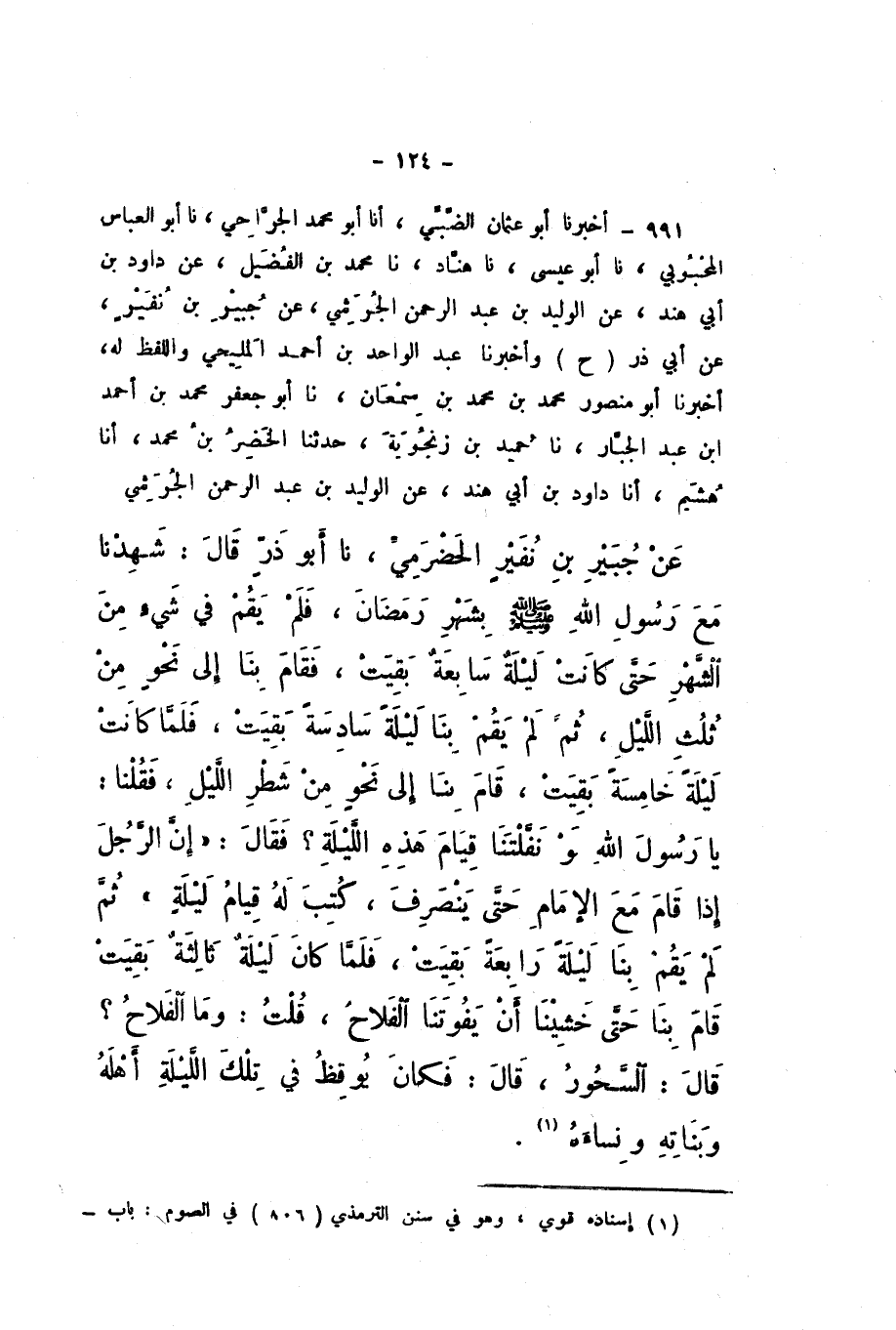 ح وَأَخْبَرَنَا عَبْدُ الْوَاحِدِ بْنُ أَحْمَدَ الْمَلِيحِيُّ، وَاللَّفْظُ لَهُ، أَخْبَرَنَا أَبُو مَنْصُورٍ مُحَمَّدُ بْنُ مُحَمَّدِ بْنِ سَمْعَانَ، نَا أَبُو جَعْفَرٍ مُحَمَّدُ بْنُ أَحْمَدَ بْنِ عَبْدِ الْجَبَّارِ، نَا حُمَيْدُ بْنُ زَنْجُوَيْهِ، حَدَّثَنَا الْخَضِرُ بْنُ مُحَمَّدٍ، أَنا هُشَيْمٌ، أَنا دَاوُدُ بْنُ أَبِي هِنْدٍ، عَنِ الْوَلِيدِ بْنِ عَبْدِ الرَّحْمَنِ الْجُرَشِيِّ، عَنْ جُبَيْرِ بْنِ نُفَيْرٍ الْحَضْرَمِيِّ، نَا أَبُو ذَرٍّ، قَالَ: شَهِدْنَا مَعَ رَسُولِ اللَّهِ صَلَّى اللهُ عَلَيْهِ وَسَلَّمَ بِشَهْرِ رَمَضَانَ، فَلَمْ يَقُمْ فِي شَيْءٍ مِنَ الشَّهْرِ حَتَّى كَانَتْ لَيْلَةٌ سَابِعَةٌ بَقِيَتْ، فَقَامَ بِنَا إِلَى نَحْوٍ مِنَ ثُلُثِ اللَّيْلِ، ثُمَّ لَمْ يَقُمْ بِنَا لَيْلَةً سَادِسَةً بَقِيَتْ، فَلَمَّا كَانَتْ لَيْلَةٌ خَامِسَةٌ بَقِيَتْ، قَامَ بِنَا إِلَى نَحْوٍ مِنْ شَطْرِ اللَّيْلِ، فَقُلْنَا: يَا رَسُولَ اللَّهِ، لَوْ نَفَّلْتَنَا قِيَامَ هَذِهِ اللَّيْلَةِ؟ فَقَالَ: «إِنَّ الرَّجُلَ إِذَا قَامَ مَعَ الإِمَامِ حَتَّى يَنْصَرِفَ، كُتِبَ لَهُ قِيَامُ لَيْلَةٍ، ثُمَّ لَمْ يَقُمْ بِنَا لَيْلَةً رَابِعَةً بَقِيَتْ، فَلَمَّا كَانَ لَيْلَةٌ ثَالِثَةٌ بَقِيَتْ قَامَ بِنَا حَتَّى خَشِينَا أَنْ يَفُوتَنَا الْفَلاحُ»، قُلْتُ: وَمَا الْفَلاحُ؟ قَالَ: السَّحُورُ، قَالَ: فَكَانَ يُوقِظُ فِي تِلْكَ اللَّيْلَةِ أَهْلَهُ وَبَنَاتِهِ وَنِسَاءَهُ.