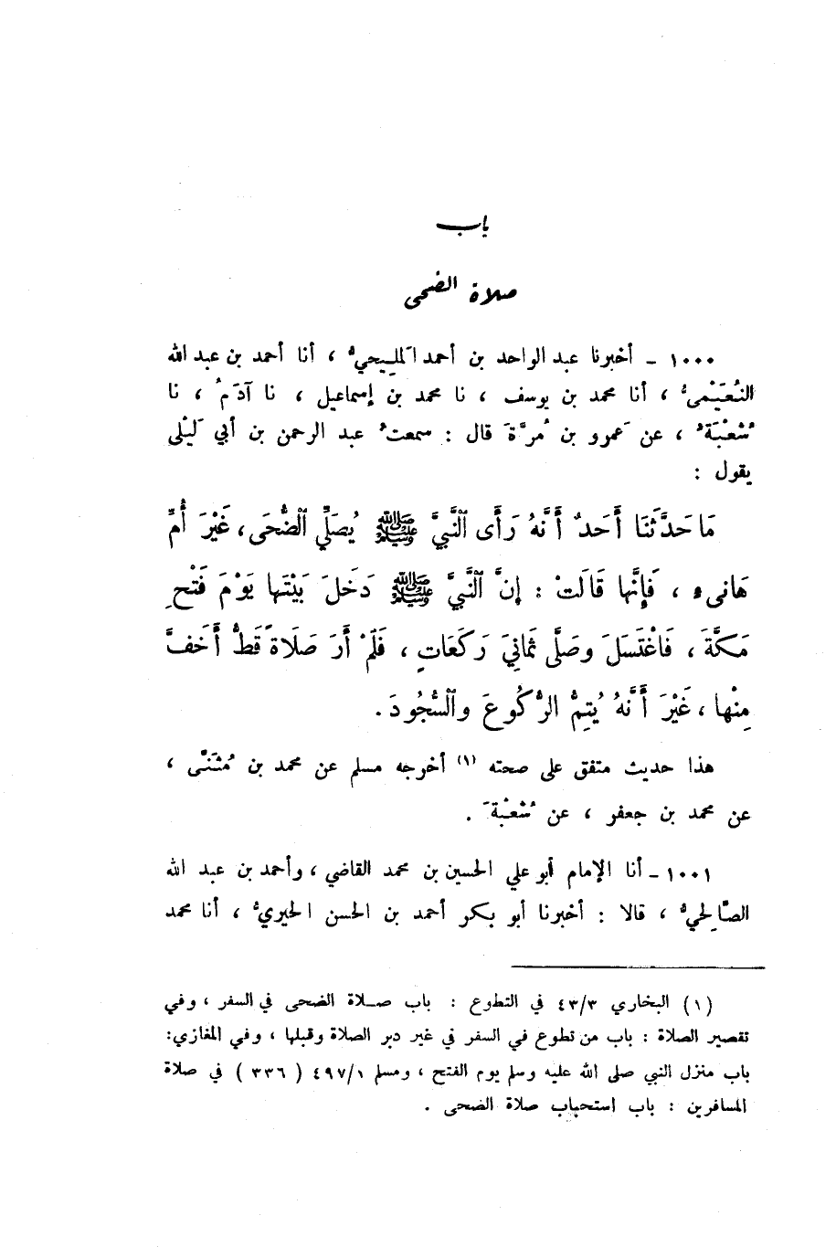 1000 - أَخْبَرَنَا عَبْدُ الْوَاحِدِ بْنُ أَحْمَدَ الْمَلِيحِيُّ، أَنا أَحْمَدُ بْنُ عَبْدِ اللَّهِ النُّعَيْمِيُّ، أَنا مُحَمَّدُ بْنُ يُوسُفَ، نَا مُحَمَّدُ بْنُ إِسْمَاعِيلَ، نَا آدَمُ، نَا شُعْبَةُ، عَنْ عَمْرِو بْنِ مُرَّةَ، قَالَ: سَمِعْتُ عَبْدَ الرَّحْمَنِ بْنَ أَبِي لَيْلَى، يَقُولُ: مَا حَدَّثَنَا أَحَدٌ أَنَّهُ رَأَى النَّبِيَّ صَلَّى اللهُ عَلَيْهِ وَسَلَّمَ يُصَلِّي الضُّحَى، غَيْرَ أُمِّ هَانِئٍ، فَإِنَّهَا قَالَتْ: «إِنَّ النَّبِيَّ صَلَّى اللهُ عَلَيْهِ وَسَلَّمَ دَخَلَ بَيْتَهَا يَوْمَ فَتْحِ مَكَّةَ، فَاغْتَسَلَ وَصَلَّى ثَمَانِيَ رَكَعَاتٍ، فَلَمْ أَرَ صَلاةً قَطُّ أَخَفَّ مِنْهَا، غَيْرَ أَنَّهُ يُتِمُّ الرُّكُوعَ وَالسُّجُودَ».