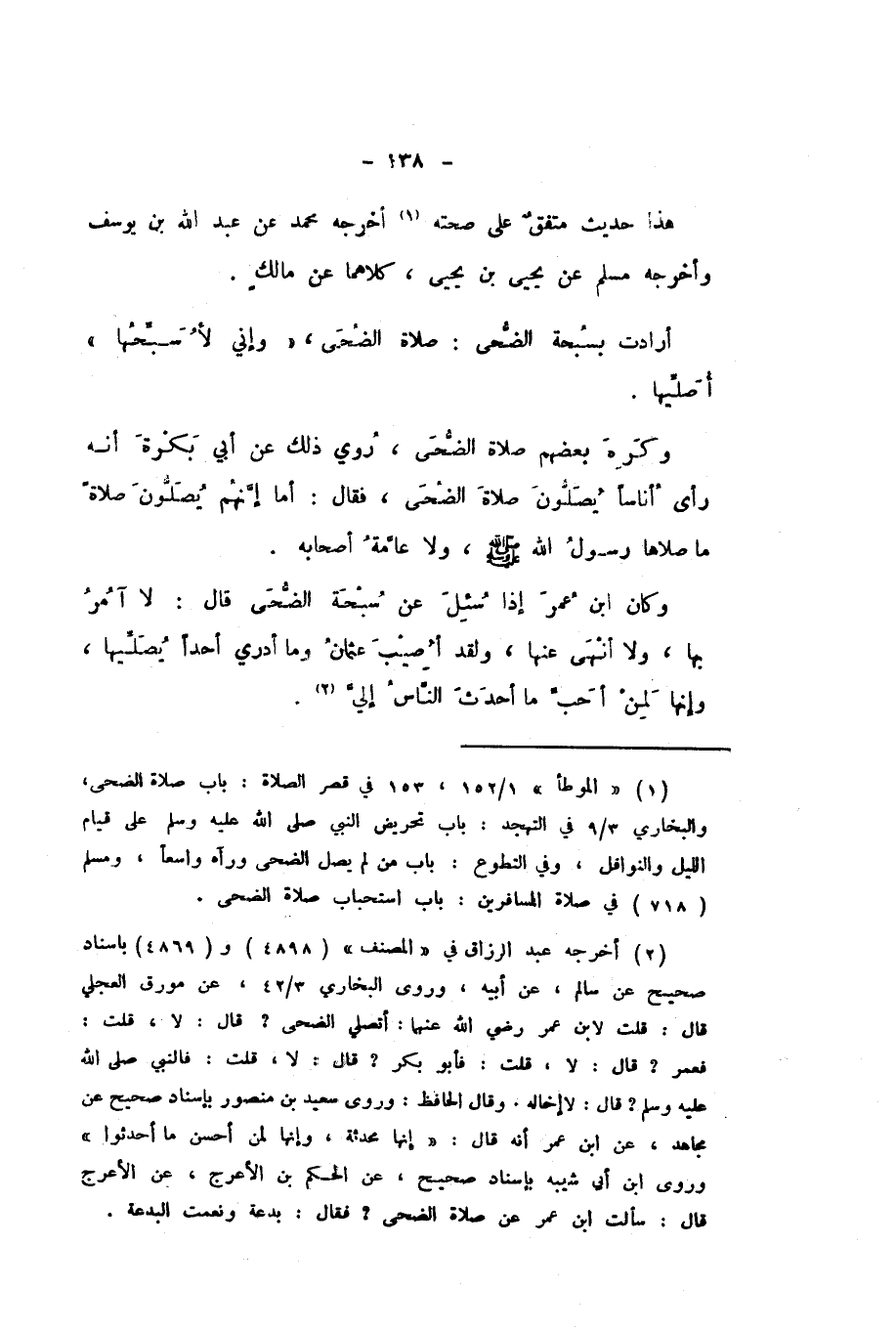 وَكَانَ ابْنُ عُمَرَ إِذَا سُئِلَ عَنْ سُبْحَةِ الضُّحَى، قَالَ: لَا آمُرُ بِهَا، وَلا أَنْهَى عَنْهَا، وَلَقَدْ أُصِيبَ عُثْمَانُ، وَمَا أَدْرِي أَحَدًا يُصَلِّيهَا، وَإِنَّهَا لَمِنْ أَحَبِّ مَا أَحْدَثَ النَّاسُ إِلَيَّ