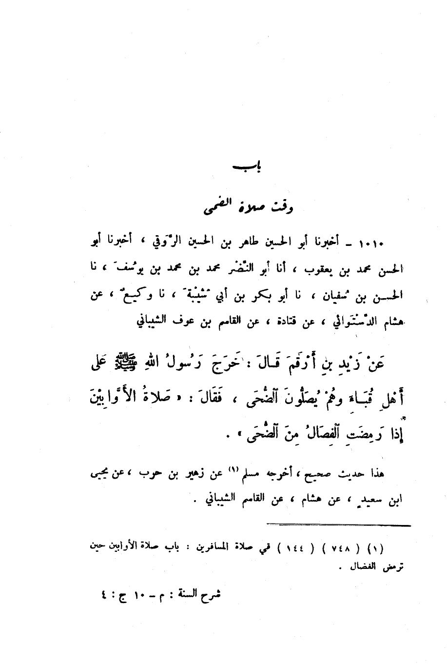 1010 - أَخْبَرَنَا أَبُو الْحُسَيْنِ طَاهِرُ بْنُ الْحُسَيْنِ الرَّوَقِيُّ، أَخْبَرَنَا أَبُو الْحَسَنِ مُحَمَّدُ بْنُ يَعْقُوبَ، أَنا أَبُو النَّضْرِ مُحَمَّدُ بْنُ مُحَمَّدِ بْنِ يُوسُفَ، نَا الْحَسَنُ بْنُ سُفْيَانَ، نَا أَبُو بَكْرِ بْنُ أَبِي شَيْبَةَ، نَا وَكِيعٌ، عَنْ هِشَامٍ الدَّسْتُوَائِيِّ، عَنْ قَتَادَةَ، عَنِ الْقَاسِمِ بْنِ عَوْفٍ الشَّيْبَانِيِّ، عَنْ زَيْدِ بْنِ أَرْقَمَ، قَالَ: خَرَجَ رَسُولُ اللَّهِ صَلَّى اللهُ عَلَيْهِ وَسَلَّمَ عَلَى أَهْلِ قُبَاءَ، وَهُمْ يُصَلُّونَ الضُّحَى، فَقَالَ: «صَلاةُ الأَوَّابِينَ إِذَا رَمِضَتِ الْفِصَالُ مِنَ الضُّحَى».