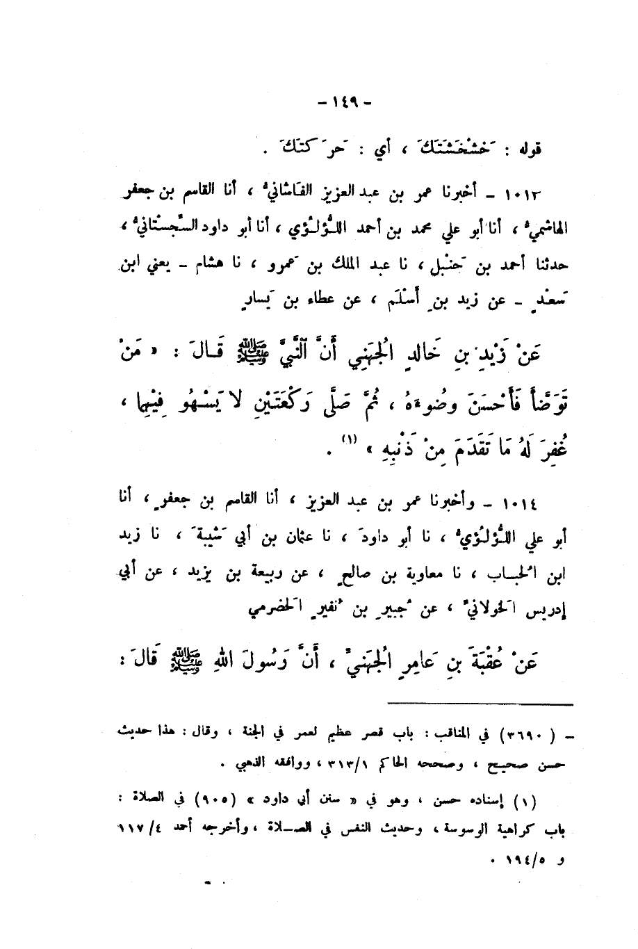 1013 - أَخْبَرَنَا عُمَرُ بْنُ عَبْدِ الْعَزِيزِ الْفَاشَانِيُّ، أَنا الْقَاسِمُ بْنُ جَعْفَرٍ الْهَاشِمِيُّ، أَنا أَبُو عَلِيٍّ مُحَمَّدُ بْنُ أَحْمَدَ اللُّؤْلُئِيُّ، أَنا أَبُو دَاوُدَ السِّجِسْتَانِيُّ، حَدَّثَنَا أَحْمَدُ بْنُ حَنْبَلٍ، نَا عَبْدُ الْمَلِكِ بْنُ عَمْرٍو، نَا هِشَامٌ، يَعْنِي ابْنَ سَعْدٍ، عَنْ زَيْدِ بْنِ أَسْلَمَ، عَنْ عَطَاءِ بْنِ يَسَارٍ، عَنْ زَيْدِ بْنِ خَالِدٍ الْجُهَنِيِّ، أَنَّ النَّبِيَّ صَلَّى اللهُ عَلَيْهِ وَسَلَّمَ، قَالَ: «مَنْ تَوَضَّأَ فَأَحْسَنَ وُضُوءَهُ، ثُمَّ صَلَّى رَكْعَتَيْنِ لَا يَسْهُو فِيهِمَا، غُفِرَ لَهُ مَا تَقَدَّمَ مِنْ ذَنْبِهِ»