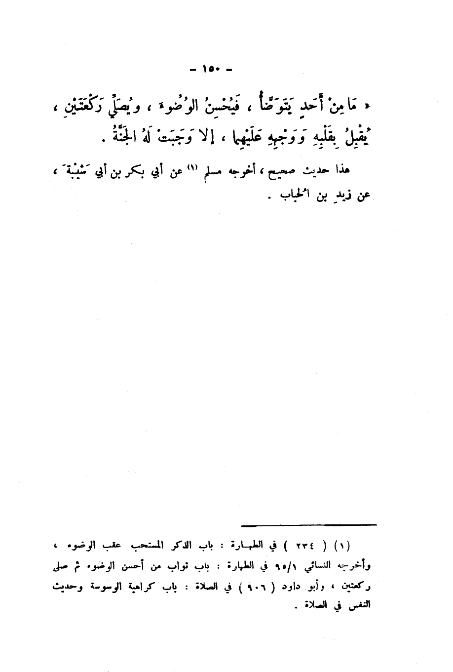 مَا مِنْ أَحَدٍ يَتَوَضَّأُ، فَيُحْسِنُ الْوُضُوءَ، وَيُصَلِّي رَكْعَتَيْنِ، يُقْبِلُ بِقَلْبِهِ وَوَجْهِهِ عَلَيْهِمَا، إِلا وَجَبَتْ لَهُ الجَنَّةُ».