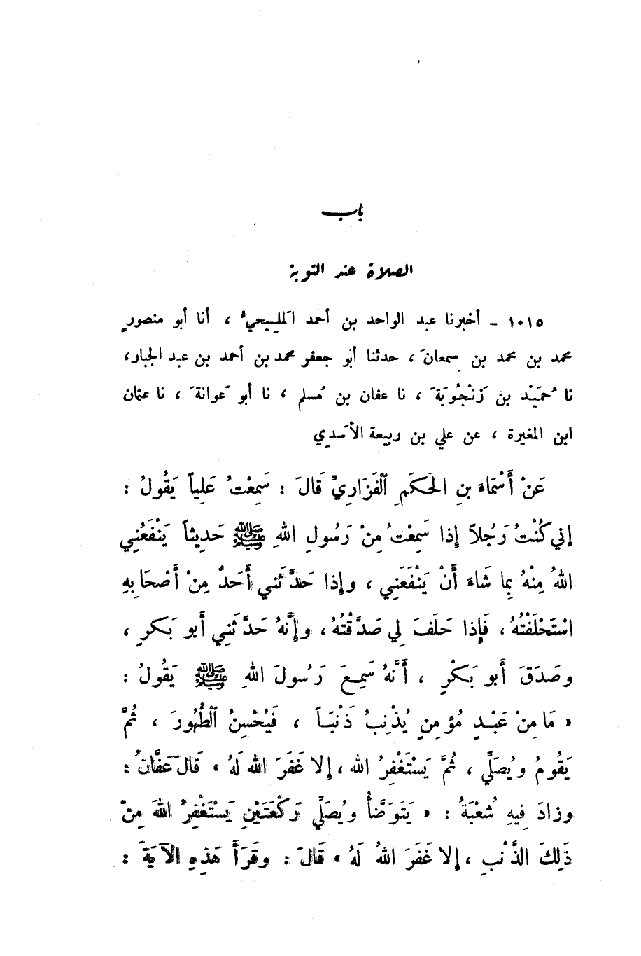 1015 - أَخْبَرَنَا عَبْدُ الْوَاحِدِ بْنُ أَحْمَدَ الْمَلِيحِيُّ، أَنا أَبُو مَنْصُورٍ مُحَمَّدُ بْنُ مُحَمَّدِ بْنِ سَمْعَانَ، حَدَّثَنَا أَبُو جَعْفَرٍ مُحَمَّدُ بْنُ أَحْمَدَ بْنِ عَبْدِ الْجَبَّارِ، نَا حُمَيْدُ بْنُ زَنْجُوَيْهِ، نَا عَفَّانُ بْنُ مُسْلِمٍ، نَا أَبُو عَوَانَةَ، نَا عُثْمَانُ بْنُ الْمُغِيرَةِ، عَنْ عَلِيِّ بْنِ رَبِيعَةَ الأَسَدِيِّ، عَنْ أَسْمَاءَ بْنِ الْحَكَمِ الْفَزَارِيِّ، قَالَ: سَمِعْتُ عَلِيًّا، يَقُولُ: إِنِّي كُنْتُ رَجُلا إِذَا سَمِعْتُ مِنْ رَسُولِ اللَّهِ صَلَّى اللهُ عَلَيْهِ وَسَلَّمَ حَدِيثًا يَنْفَعُنِي اللَّهُ مِنْهُ بِمَا شَاءَ أَنْ يَنْفَعَنِي، وَإِذَا حَدَّثَنِي أَحَدٌ مِنْ أَصْحَابِهِ اسْتَحْلَفْتُهُ، فَإِذَا حَلَفَ لِي صَدَّقْتُهُ، وَإِنَّهُ حَدَّثَنِي أَبُو بَكْرٍ، وَصَدَقَ أَبُو بَكْرٍ، أَنَّهُ سَمِعَ رَسُولَ اللَّهِ صَلَّى اللهُ عَلَيْهِ وَسَلَّمَ، يَقُولُ: «مَا مِنْ عَبْدٍ مُؤْمِنٍ يُذْنِبُ ذَنْبًا، فَيُحْسِنُ الطُّهُورَ، ثُمَّ يَقُومُ وَيُصَلِّي، ثُمَّ يَسْتَغْفِرُ اللَّهَ، إِلا غَفَرَ اللَّهُ لَهُ».