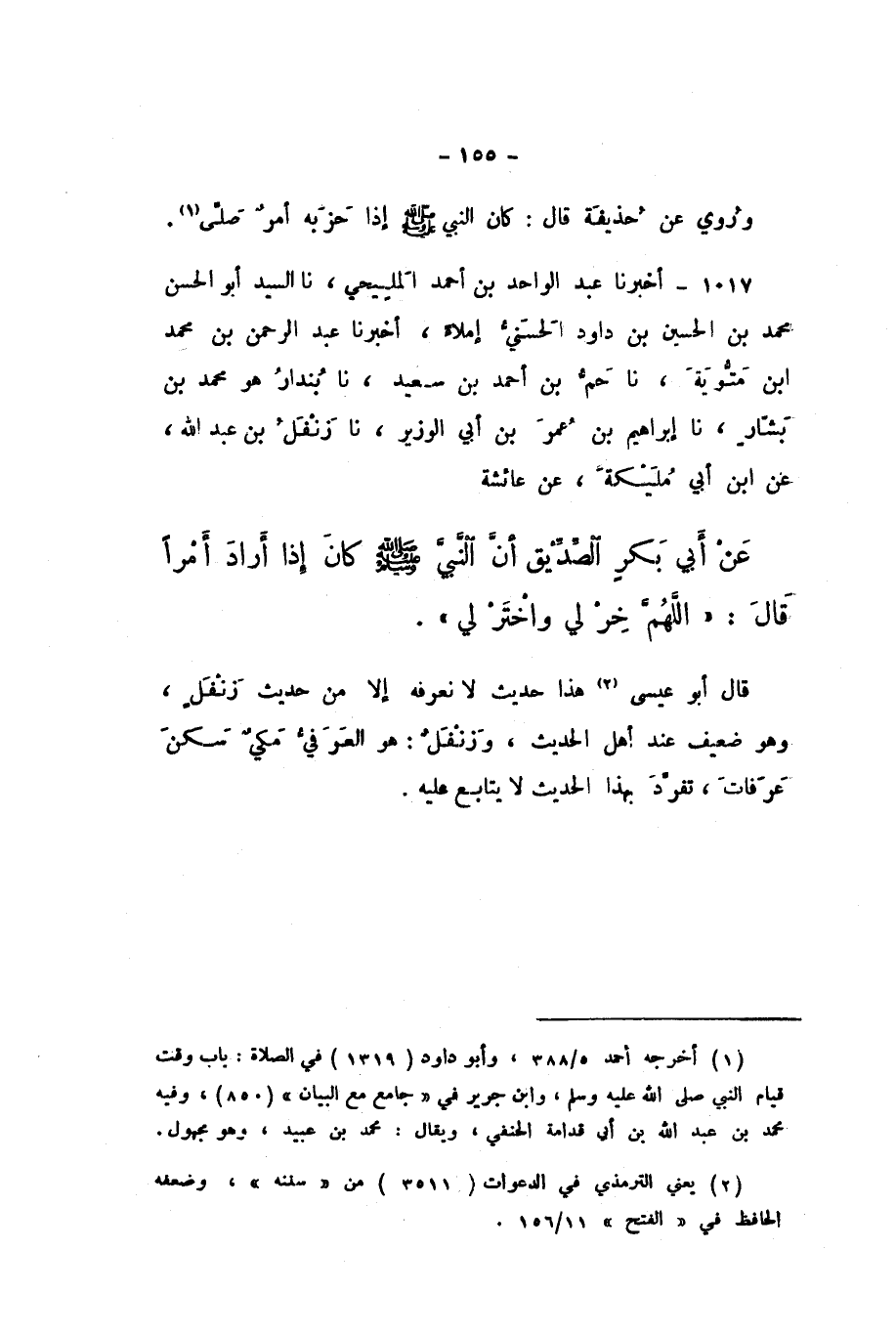 1017 - أَخْبَرَنَا عَبْدُ الْوَاحِدِ بْنُ أَحْمَدَ الْمَلِيحِيُّ، نَا السَّيِّدُ أَبُو الْحَسَنِ مُحَمَّدُ بْنُ الْحُسَيْنِ بْنِ دَاوُدَ الْحَسَنِيُّ، إِمْلاءً، أَخْبَرَنَا عَبْدُ الرَّحْمَنِ بْنُ مُحَمَّدِ بْنِ مَتُّوَيْهِ، نَا حَمُّ بْنُ أَحْمَدَ بْنِ سَعِيدٍ، نَا بُنْدَارٌ هُوَ مُحَمَّدُ بْنُ بَشَّارٍ، نَا إِبْرَاهِيمُ بْنُ عُمَرَ بْنِ أَبِي الْوَزِيرِ، نَا زَنْفَلُ بْنُ عَبْدِ اللَّهِ، عَنِ ابْنِ أَبِي مُلَيْكَةَ، عَنْ عَائِشَةَ، عَنْ أَبِي بَكْرٍ الصِّدِّيقِ، أَنَّ النَّبِيَّ صَلَّى اللهُ عَلَيْهِ وَسَلَّمَ كَانَ إِذَا أَرَادَ أَمْرًا، قَالَ: «اللَّهُمَّ خِرْ لِي وَاخْتَرْ لِي».
