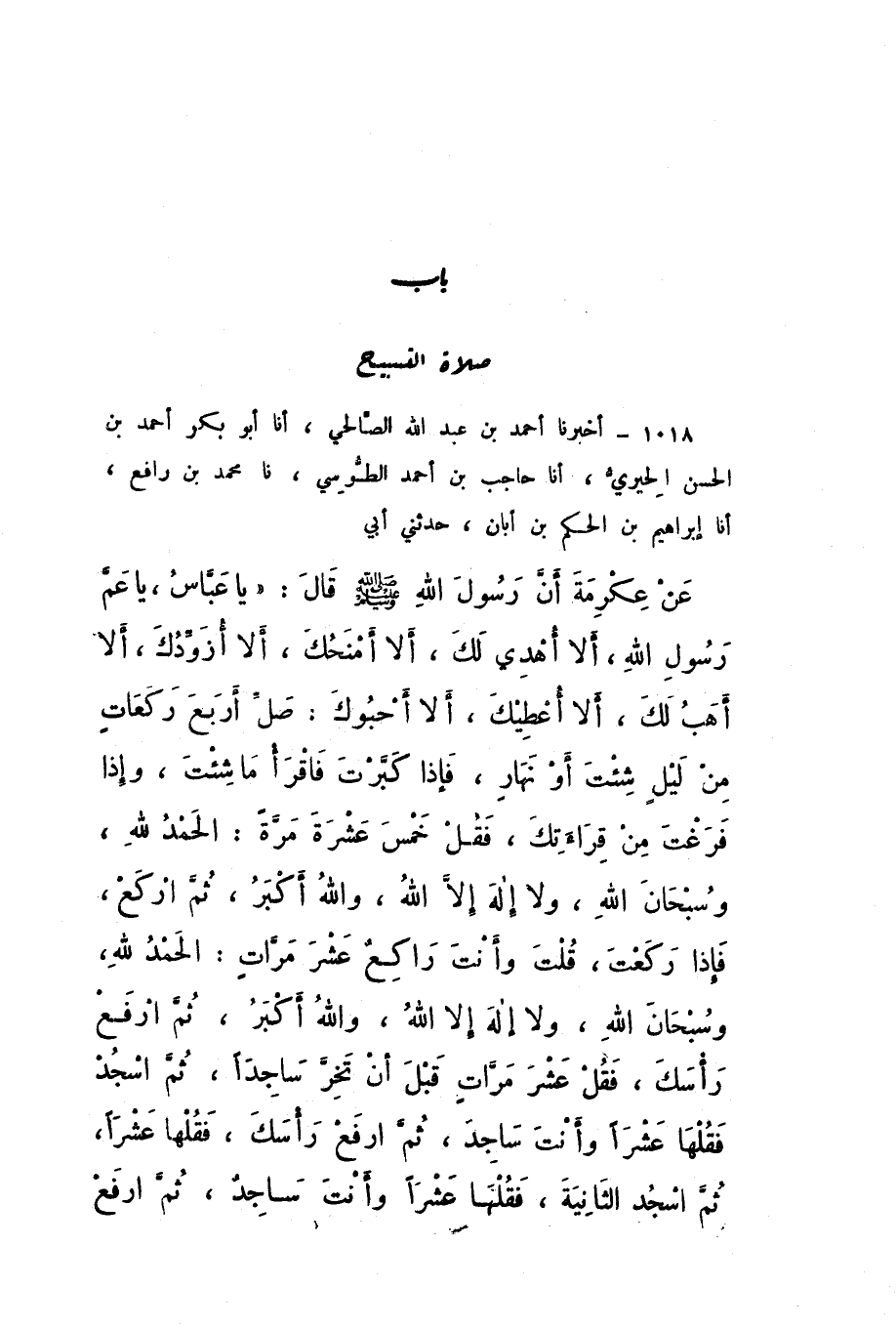 1018 - أَخْبَرَنَا أَحْمَدُ بْنُ عَبْدِ اللَّهِ الصَّالِحِيُّ، أَنا أَبُو بَكْرٍ أَحْمَدُ بْنُ الْحَسَنِ الْحِيرِيُّ، أَنا حَاجِبُ بْنُ أَحْمَدَ الطُّوسِيُّ، نَا مُحَمَّدُ بْنُ رَافِعٍ، أَنا إِبْرَاهِيمُ بْنُ الْحَكَمِ بْنِ أَبَانٍ، حَدَّثَنِي أَبِي، عَنْ عِكْرِمَةَ، أَنَّ رَسُولَ اللَّهِ صَلَّى اللهُ عَلَيْهِ وَسَلَّمَ، قَالَ: " يَا عَبَّاسُ، يَا عَمَّ رَسُولِ اللَّهِ، أَلا أُهْدِي لَكَ، أَلا أَمْنَحُكَ، أَلا أُزَوِّدُكَ، أَلا أَهَبُ لَكَ، أَلا أُعْطِيكَ، أَلا أَحْبُوكَ: صَلِّ أَرْبَعَ رَكَعَاتٍ مِنْ لَيْلٍ شِئْتَ أَوْ نَهَارٍ، فَإِذَا كَبَّرْتَ فَاقْرَأْ مَا شِئْتَ، وَإِذَا فَرَغْتَ مِنْ قِرَاءَتِكَ، فَقُلْ خَمْسَ عَشْرَةَ مَرَّةً: الْحَمْدُ لِلَّهِ، وَسُبْحَانَ اللَّهِ، وَلا إِلَهَ إِلا اللَّهُ، وَاللَّهُ أَكْبَرُ، ثُمَّ ارْكَعْ، فَإِذَا رَكَعْتَ، قُلْتَ، وَأَنْتَ رَاكِعٌ، عَشْرَ مَرَّاتٍ: الْحَمْدُ لِلَّهِ، وَسُبْحَانَ اللَّهِ، وَلا إِلَهَ إِلا اللَّهُ، وَاللَّهُ أَكْبَرُ، ثُمَّ ارْفَعْ رَأْسَكَ، فَقُلْ عَشْرَ مَرَّاتٍ قَبْلَ أَنْ تَخِرَّ سَاجِدًا، ثُمَّ اسْجُدْ فَقُلْهَا عَشْرًا وَأَنْتَ سَاجِدٌ، ثُمَّ ارْفَعْ رَأْسَكَ، فَقُلْهَا عَشْرًا، ثُمَّ اسْجُدِ الثَّانِيَةَ، فَقُلْهَا عَشْرًا، وَأَنْتَ سَاجِدٌ، ثُمَّ ارْفَعْ