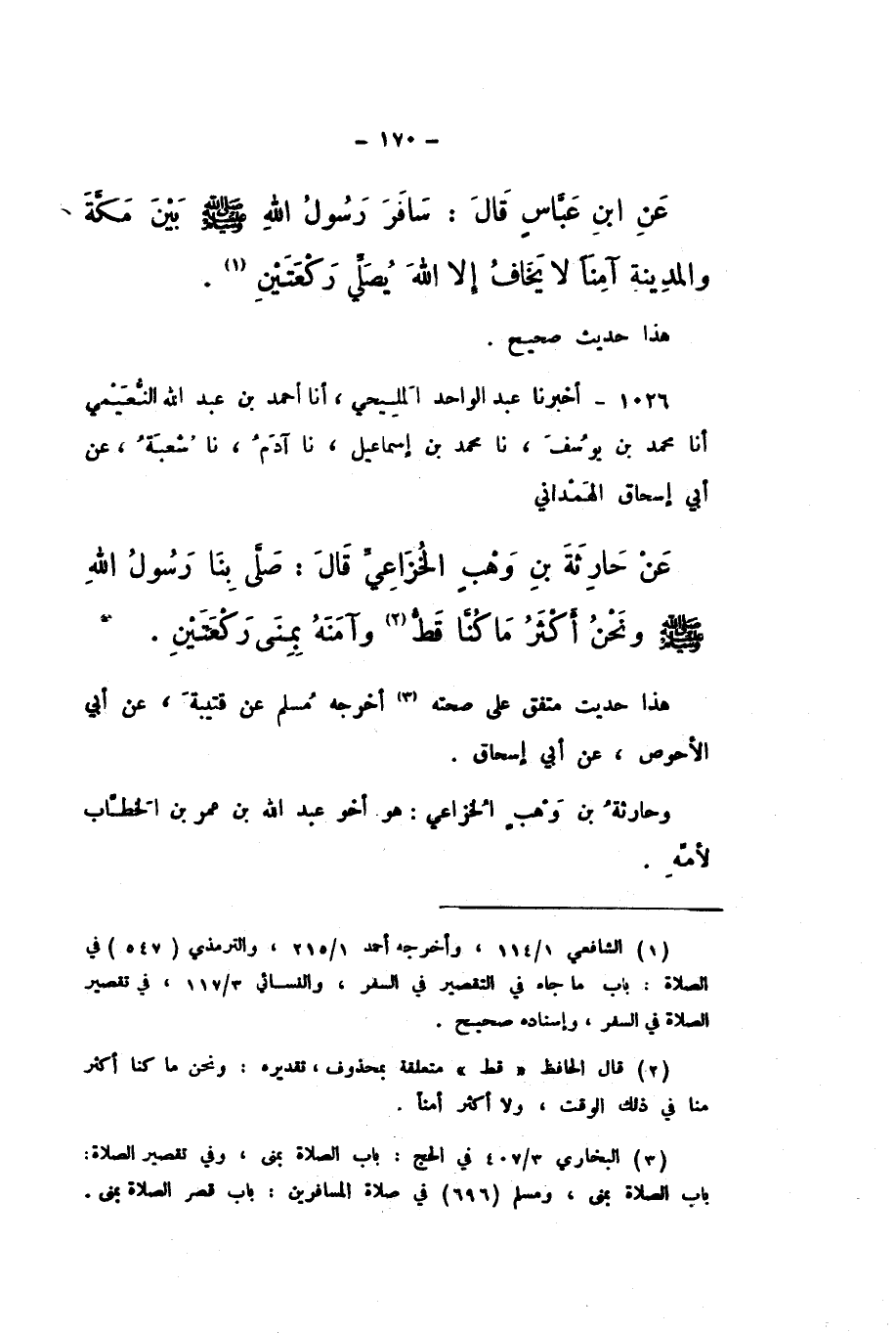1026 - أَخْبَرَنَا عَبْدُ الْوَاحِدِ الْمَلِيحِيُّ، أَنا أَحْمَدُ بْنُ عَبْدِ اللَّهِ النُّعَيْمِيُّ، أَنا مُحَمَّدُ بْنُ يُوسُفَ، نَا مُحَمَّدُ بْنُ إِسْمَاعِيلَ، نَا آدَمُ، نَا شُعْبَةُ، عَنْ أَبِي إِسْحَاقَ الْهَمْدَانِيِّ، عَنْ حَارِثَةَ بْنِ وَهْبٍ الْخُزَاعِيِّ، قَالَ: «صَلَّى بِنَا رَسُولُ اللَّهِ صَلَّى اللهُ عَلَيْهِ وَسَلَّمَ وَنَحْنُ أَكْثَرُ مَا كُنَّا قَطُّ وَآمَنَهُ بِمِنًى رَكْعَتَيْنِ».