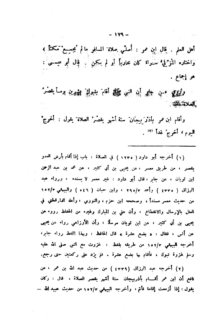 وَأَقَامَ ابْنُ عُمَرَ بِأَذْرَبِيجَانَ سِتَّةَ أَشْهُرٍ يَقْصُرُ الصَّلاةَ، يَقُولُ: أَخْرُجُ الْيَوْمَ، أَخْرُجُ غَدًا.