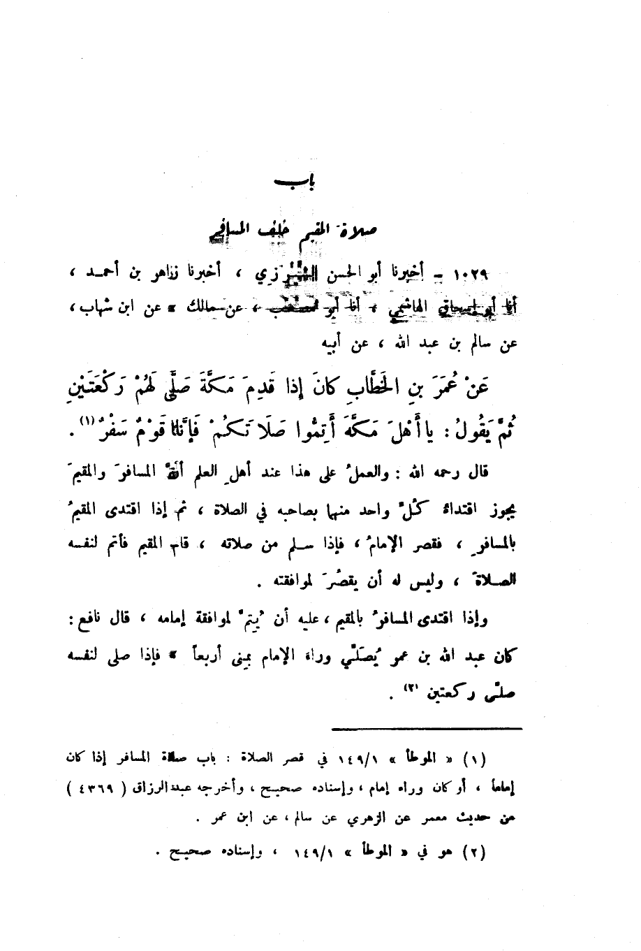 1029 - أَخْبَرَنَا أَبُو الْحَسَنِ الشِّيرَزِيُّ، أَخْبَرَنَا زَاهِرُ بْنُ أَحْمَدَ، أَنا أَبُو إِسْحَاقَ الْهَاشِمِيُّ، أَنا أَبُو مُصْعَبٍ، عَنْ مَالِكٍ، عَنِ ابْنِ شِهَابٍ، عَنْ سَالِمِ بْنِ عَبْدِ اللَّهِ، عَنْ أَبِيهِ، عَنْ عُمَرَ بْنِ الْخَطَّابِ كَانَ إِذَا قَدِمَ مَكَّةَ صَلَّى لَهُمْ رَكْعَتَيْنِ، ثُمّ يَقُولُ: «يَا أَهْلَ مَكَّةَ أَتِمُّوا صَلاتَكُمْ فَإِنَّا قَوْمٌ سَفْرٌ»