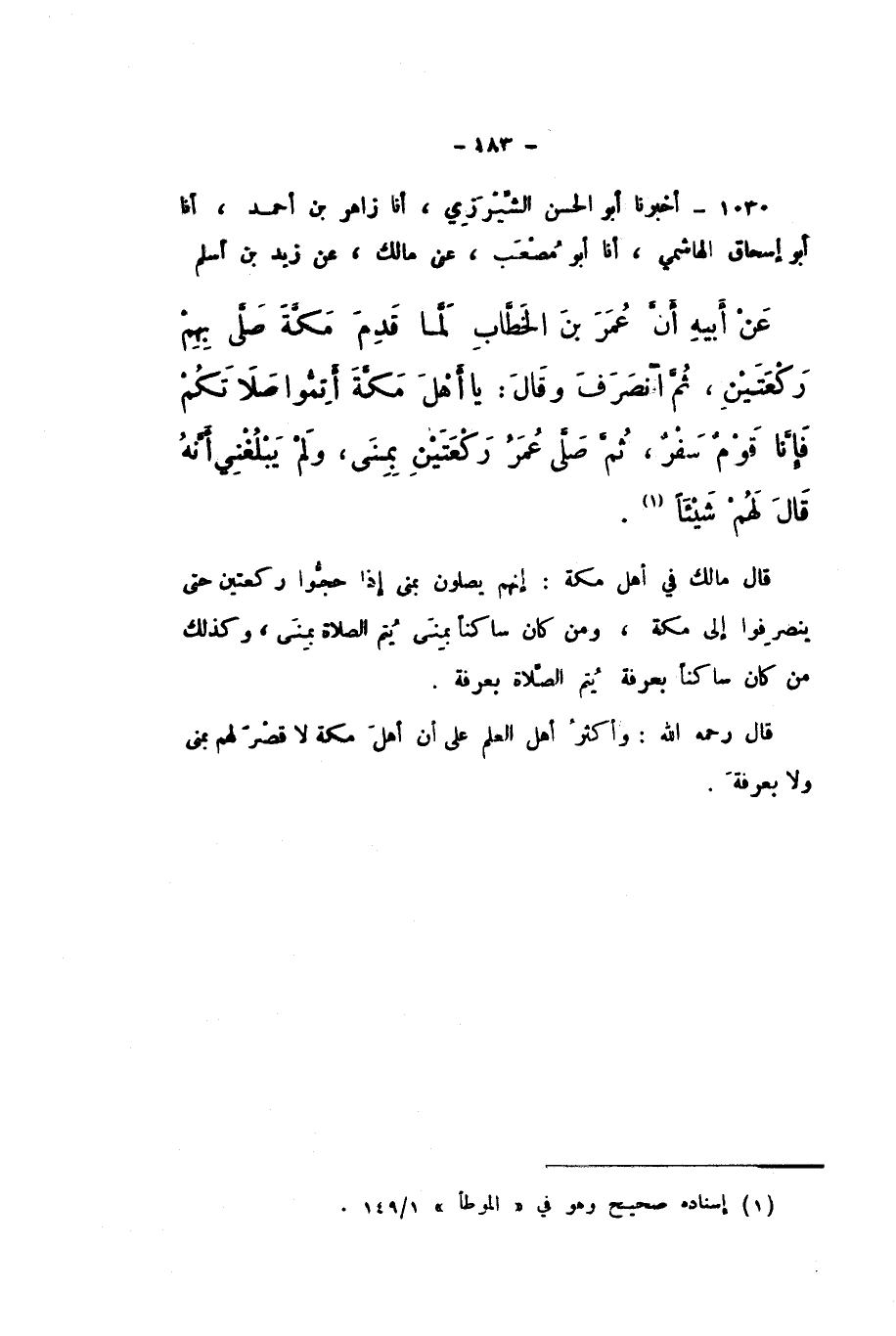 1030 - أَخْبَرَنَا أَبُو الْحَسَنِ الشِّيرَزِيُّ، أَنا زَاهِرُ بْنُ أَحْمَدَ، أَنا أَبُو إِسْحَاقَ الْهَاشِمِيُّ، أَنا أَبُو مُصْعَبٍ، عَنْ مَالِكٍ، عَنْ زَيْدِ بْنِ أَسْلَمَ، عَنْ أَبِيهِ، أَنَّ عُمَرَ بْنَ الْخَطَّابِ، لَمَّا قَدِمَ مَكَّةَ صَلَّى بِهِمْ رَكْعَتَيْنِ، ثُمَّ انْصَرَفَ، وَقَالَ: «يَا أَهْلَ مَكَّةَ أَتِمُّوا صَلاتَكُمْ، فَإِنَّا قَوْمٌ سَفْرٌ، ثُمَّ صَلَّى عُمَرُ رَكْعَتَيْنِ بِمِنًى»، وَلَمْ يَبْلُغْنِي أَنَّهُ قَالَ لَهُمْ شَيْئًا